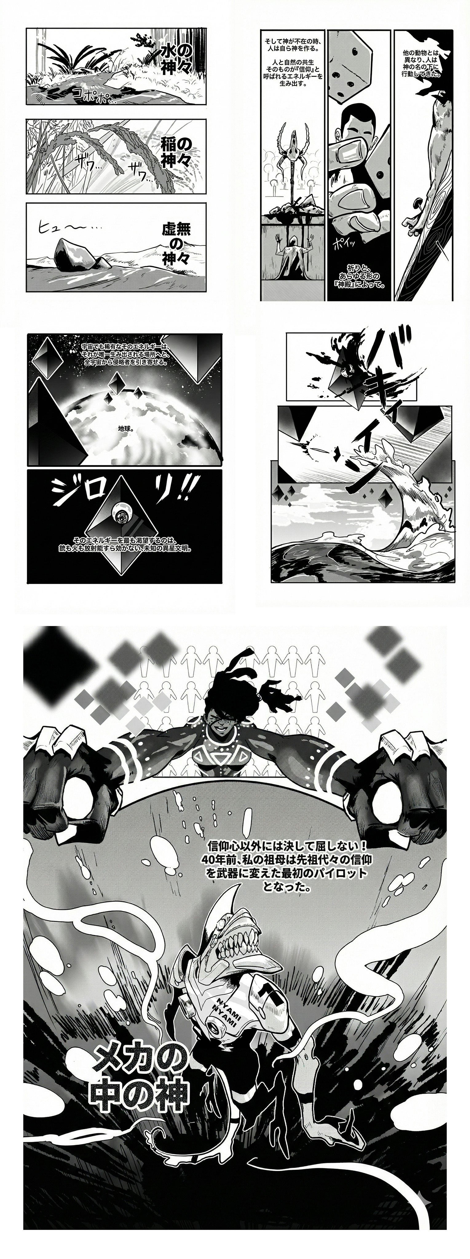 舞台は、アフリカの神話とSFが融合した世界。主人公は、アフリカ神話の魚蛇神「ニャミニャミ」をモチーフにした巨大メカを操縦することになる少年です。しかし、彼には決定的な欠点がありました。それは、この世界で最も強力な武器となる「信仰」を持っていないこと。