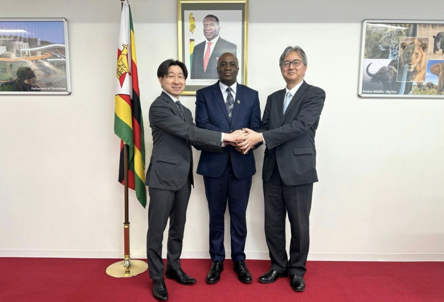 ジンバブエ共和国特命全権大使 ステュワート・ニャコチョ氏と固い握手を交わし、