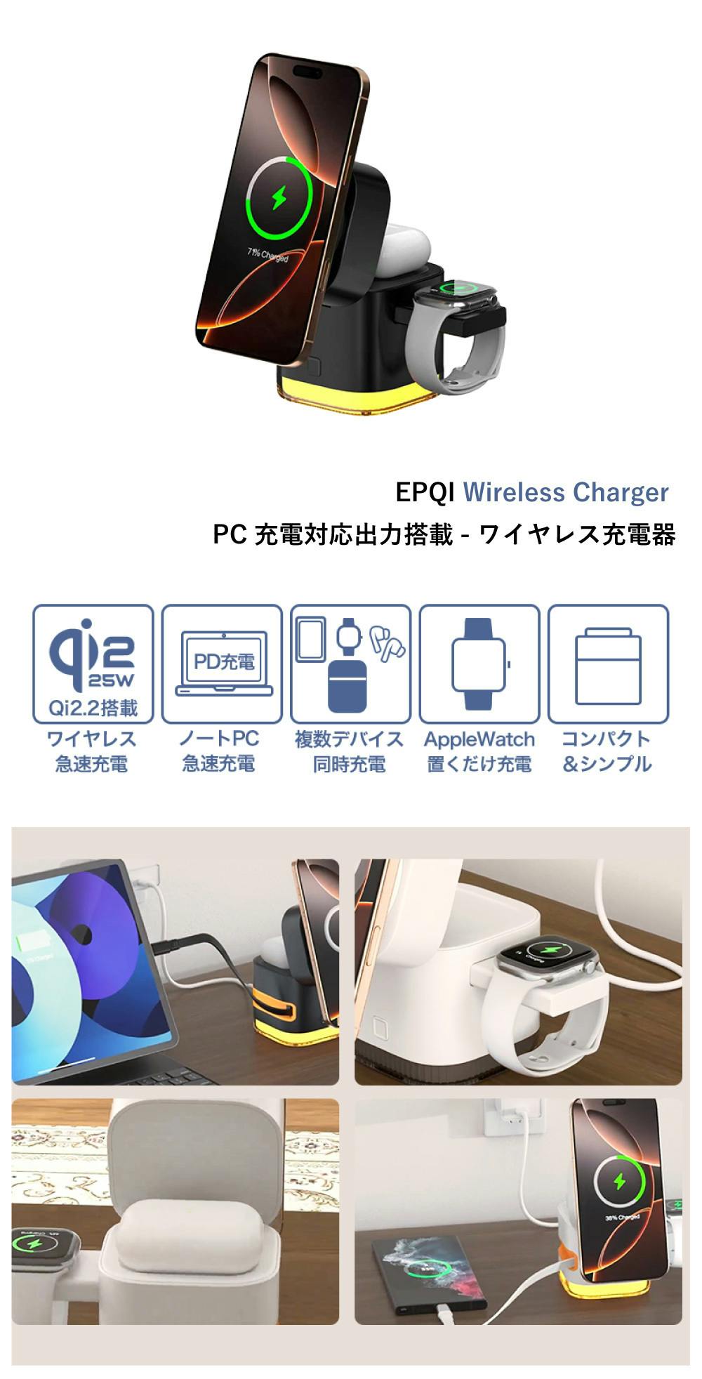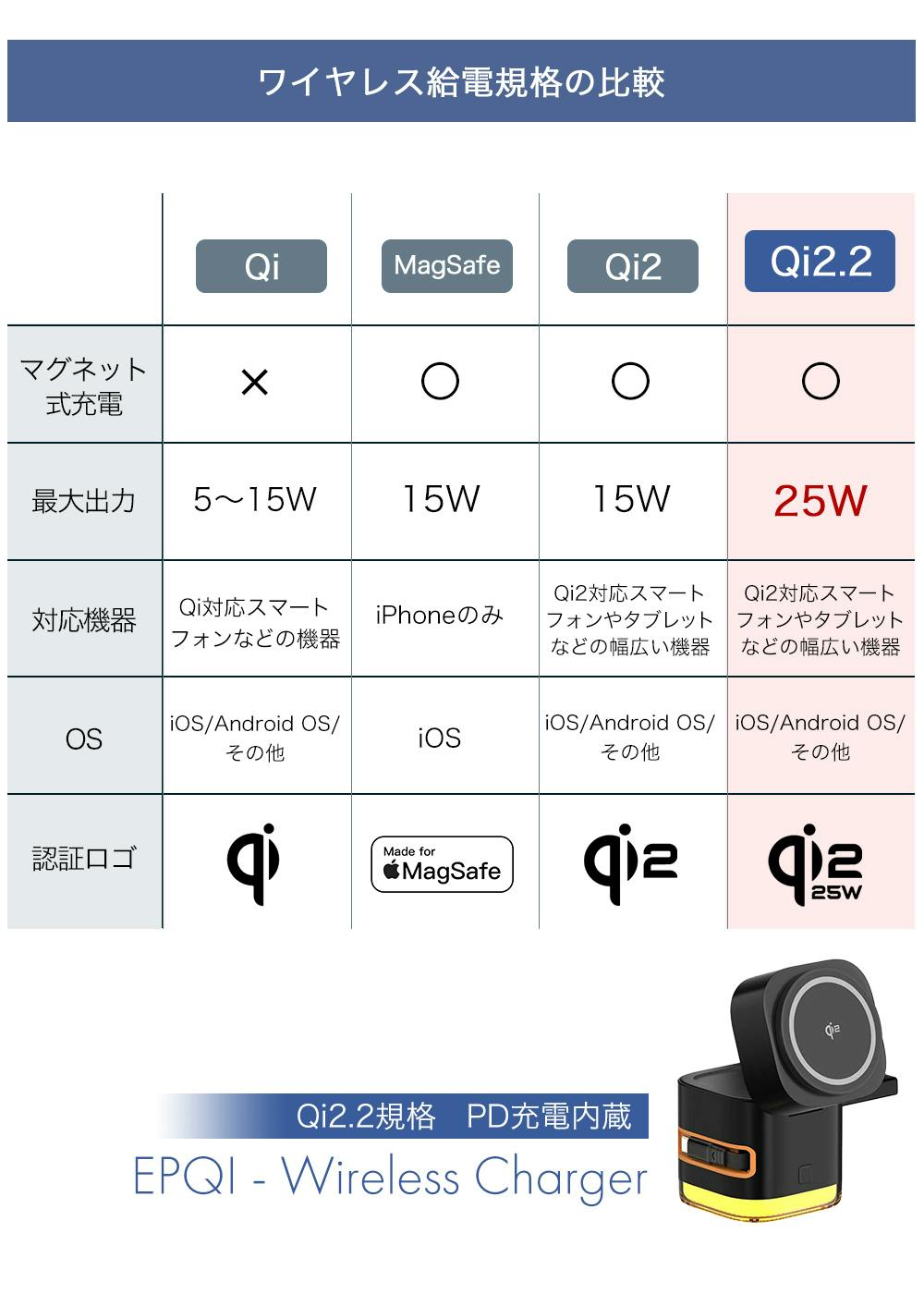 EPQIは、最新のワイヤレス充電規格 Qi2.2を搭載し、最大出力を25Wまで可能にしました。
