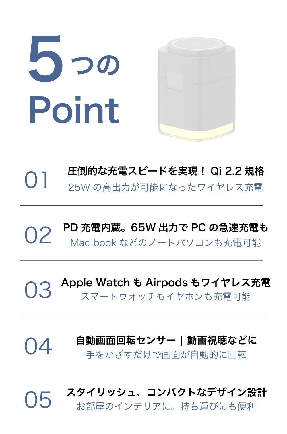 3つのワイヤレス充電ポートと65W出力のケーブル充電を同時に利用することができます。