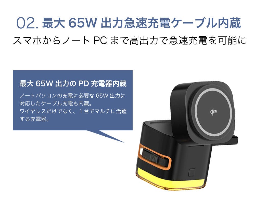 EPQIは、ワイヤレス充電だけではなく、最大65W出力が可能なケーブル型のPD充電機を内蔵しています。