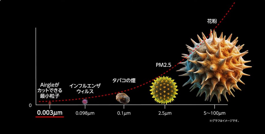 Airgle独自の cHEPAフィルター は、一般的なHEPAフィルターの約100倍の微粒子捕捉性能を誇り、わずか 0.003μm の超微粒子まで 99.999%捕捉することが試験で確認されています。