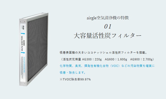 Airgleの空気清浄機には、ココナッツの殻から作られた活性炭が大量に使われています。この“大容量の活性炭”が、タバコ臭・ペット臭・生活臭・壁紙や家具のVOC(揮発性有機化合物)までしっかりと吸着。試験ではTVOC除去率99.97%を記録し、室内空気のニオイ成分を短時間で大幅に低減することが確認されています。