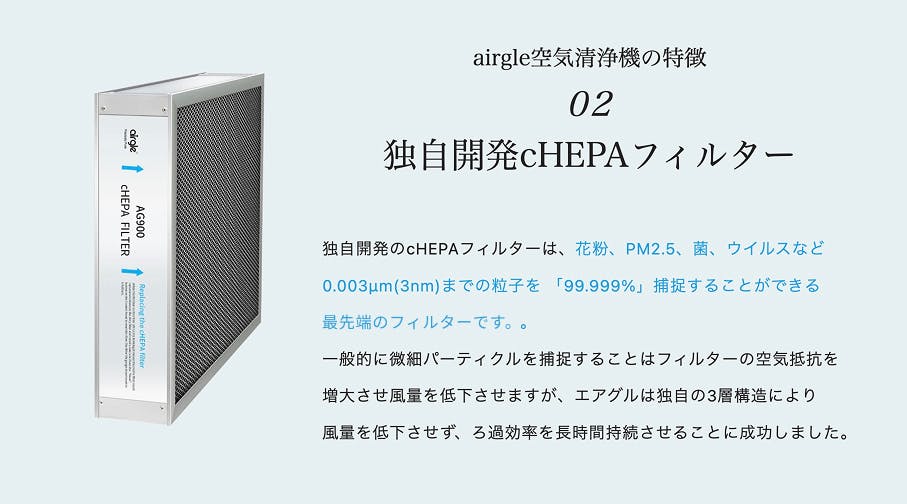 Airgle独自の cHEPAフィルター は、一般的なHEPAフィルターの約100倍の微粒子捕捉性能を誇り、わずか 0.003μm の超微粒子まで 99.999%捕捉することが試験で確認されています。