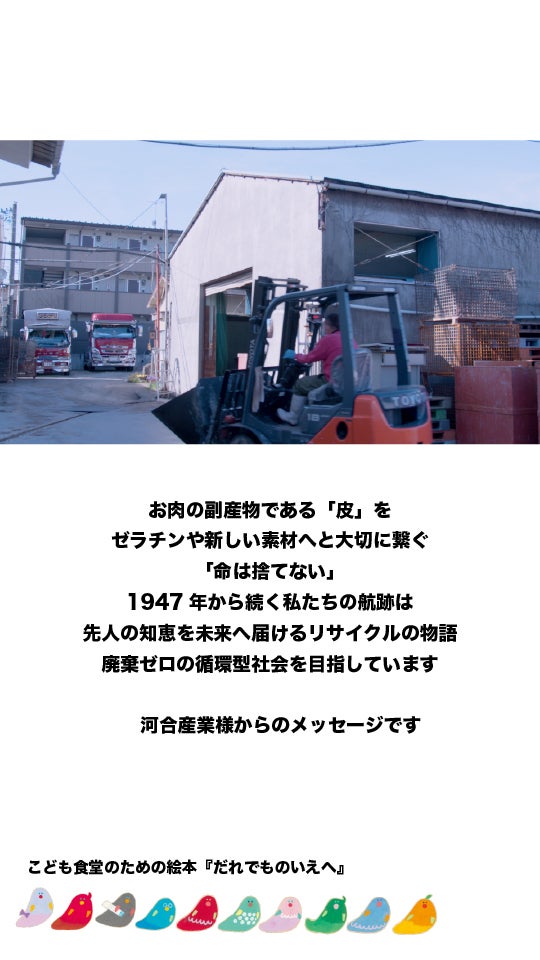 工場にお伺いするたびに感じる河合さんの動物の命への思いは、優しさや共感をふまえた上で更に、社会の継続を目指すリアルさを体幹に持つ強さを感じます。