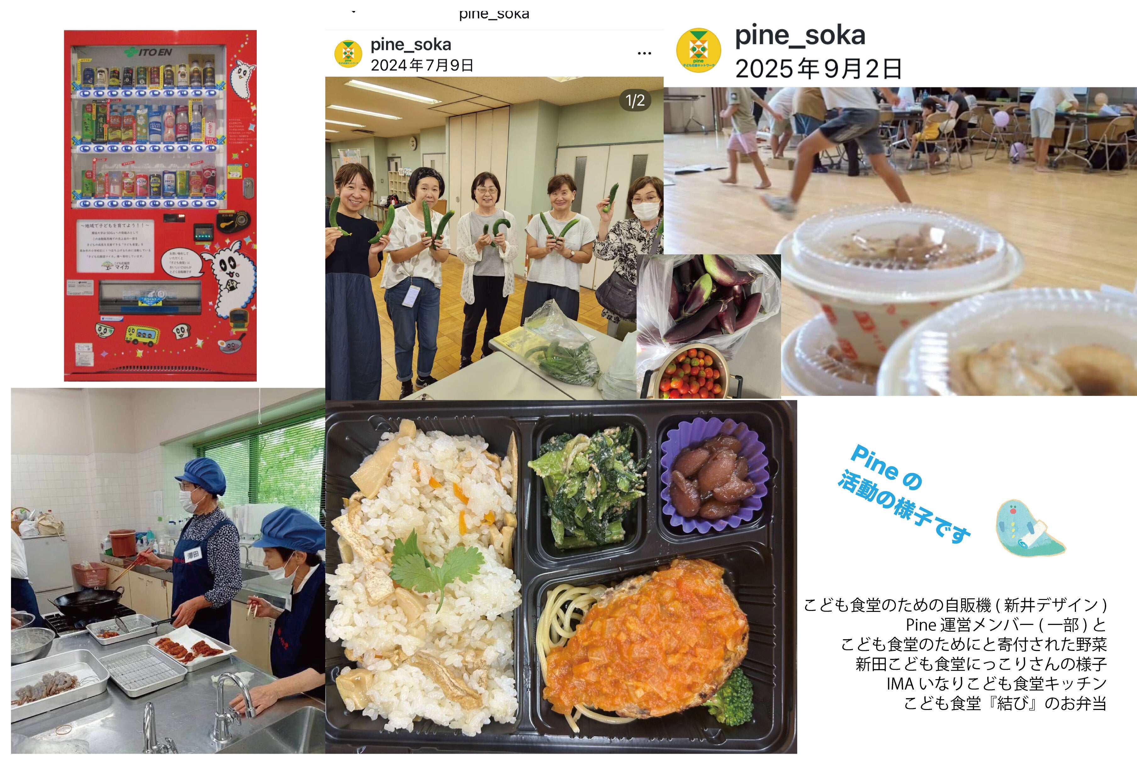 ペレカスブックデザインこども食堂に利益が生まれる自販機 自販機は獨協大学にも設置されていますPineメンバー写真(左から2番目が浜園さん) こども食堂の様子