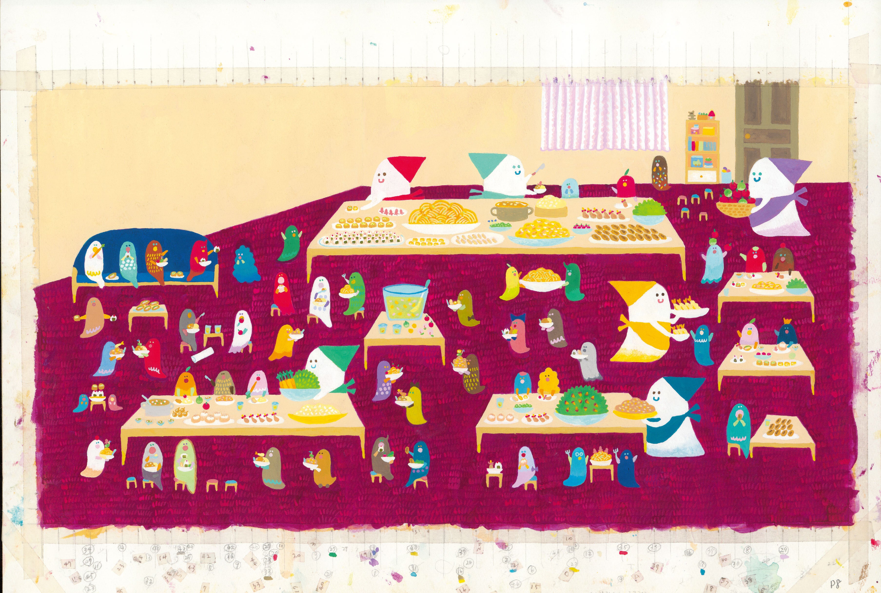 食事のシーンは「わちゃわちゃ」と。整然と座っていた食事シーンは、「こどもはもっと自由なものだよ」という指摘を受け、活気あふれる賑やかな風景に描き直しました。