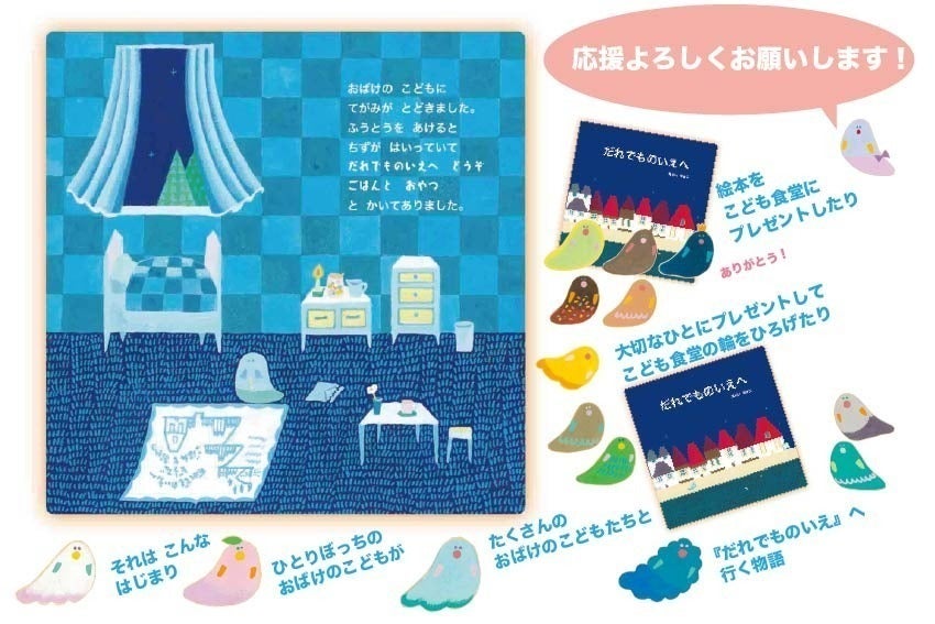 絵本『だれでものいえへ』は、ひとりぼっちだったおばけのこどもが、やがてたくさんのこどもたちと『だれでものいえ』に辿り着く物語です。