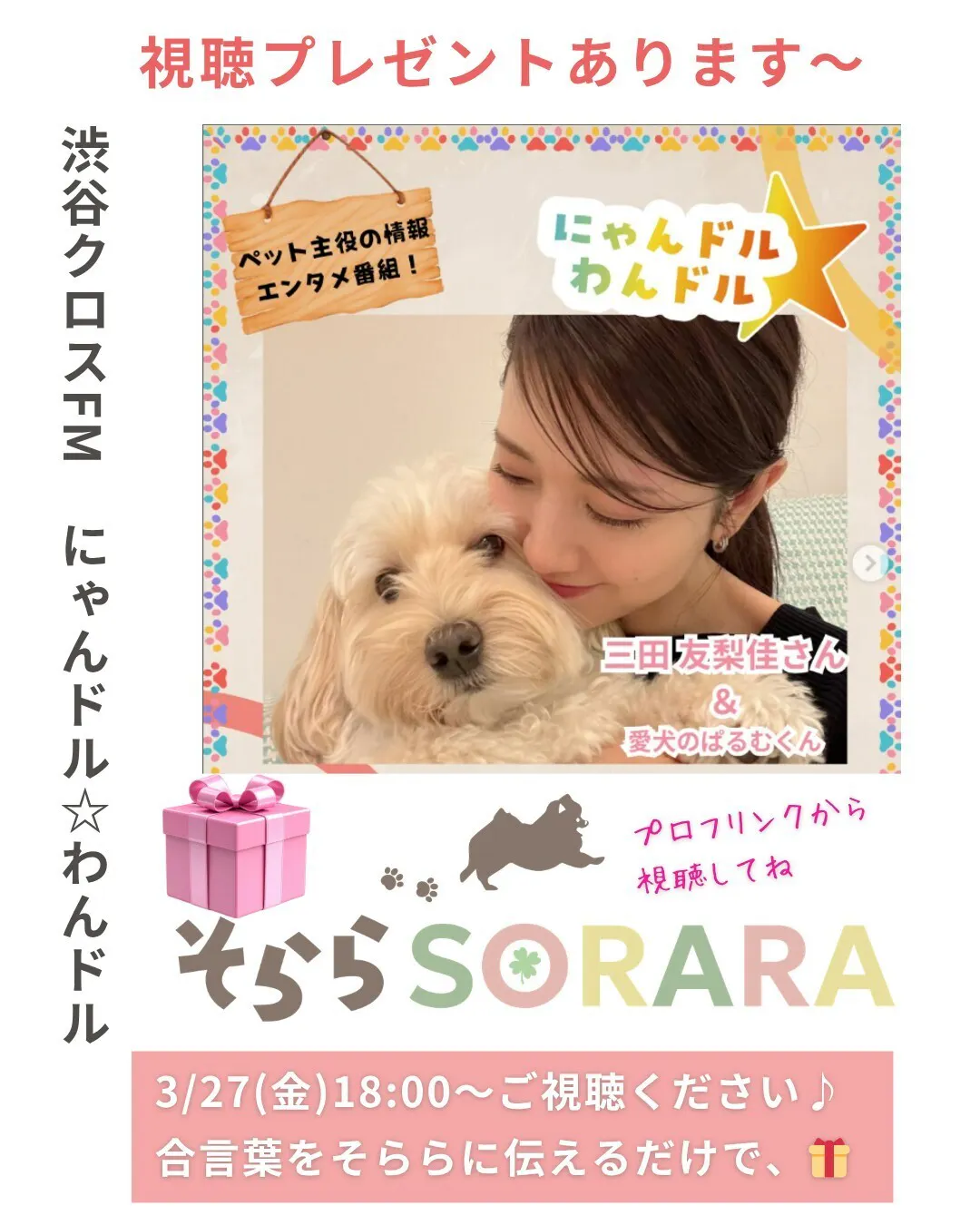 2026/03/27 11:00渋谷クロスFM出演!そららSORARA 代表が本日3/27金 18:00-、渋谷クロスFM「にゃんドル☆わんドル」に出演してきます!そららのるるる♪の魅力をたくさんお伝えできるよう、頑張ってきます‼宜しければ視聴して、応援宜しくお願い致します視聴者の方に、特別プレゼントも番組内で行いますので、お楽しみに↓18時前にこちらからご視聴♪https://shibuyacrossfm.jp/ もっと見る