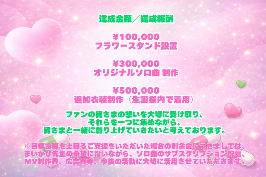 達成金額に応じて、生誕祭の内容が段階的にグレードアップしていく予定です。
