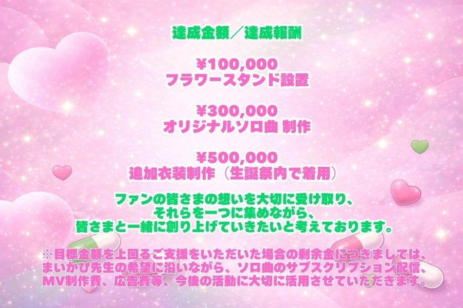 また、目標金額を上回るご支援をいただいた場合には、生誕祭後の今後の活動費として、大切に活用させていただく予定です。