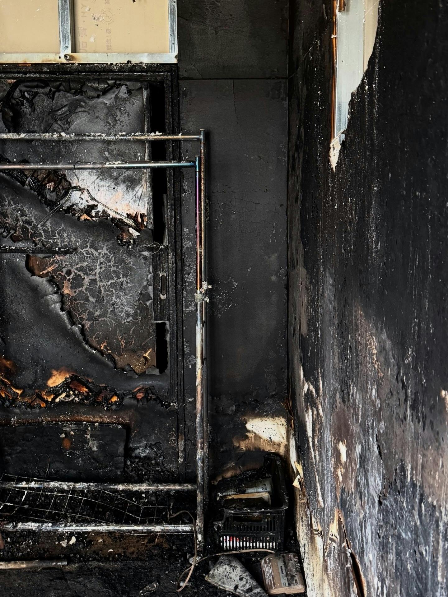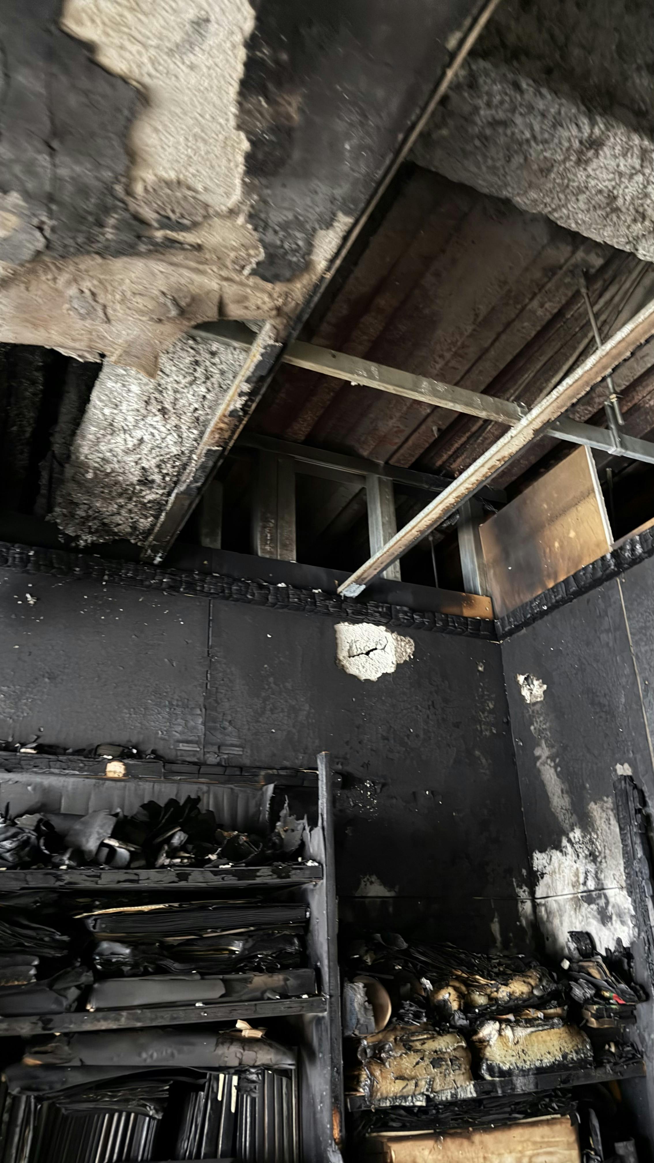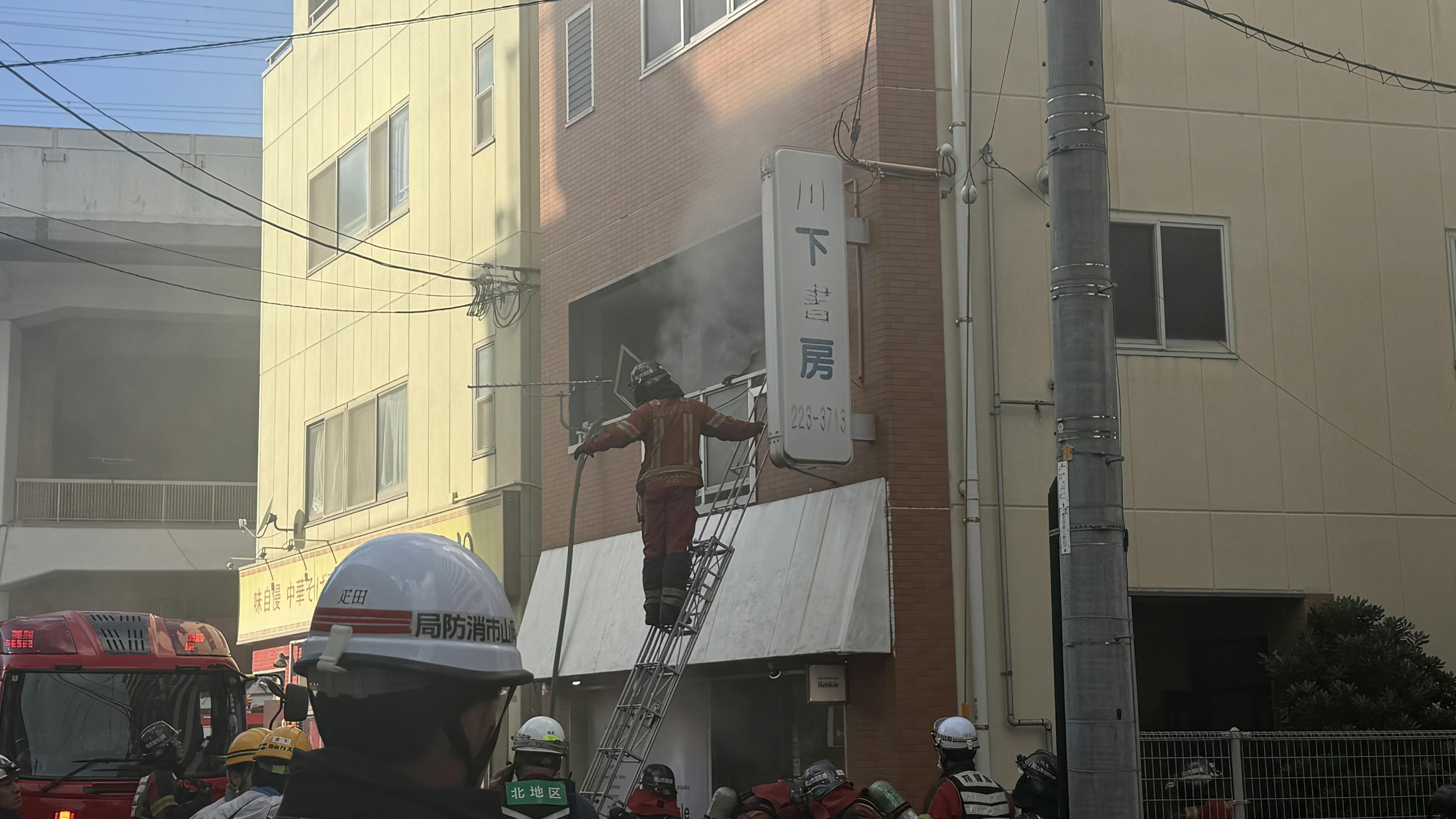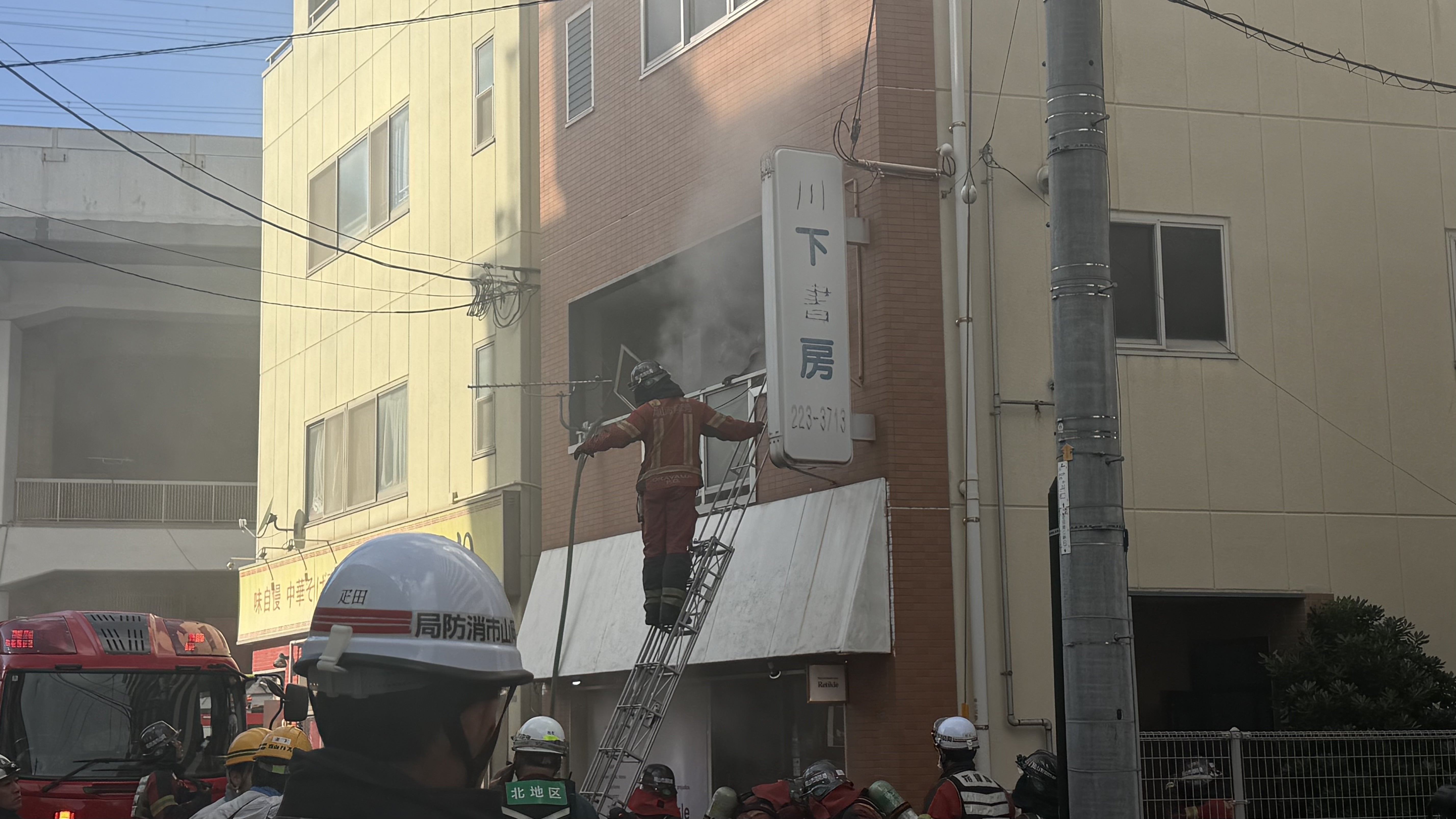 事務所兼住居であった建物の2階部分から火災が発生し、2階は全焼、1階の店舗部分も一部焼失しました。