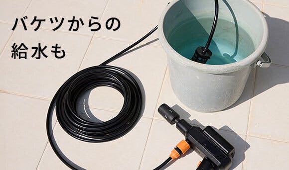 専用の給水アダプターを取り付けて、バケツに汲んだ水につけるだけ。付属のホースは10mの長さがあるので、広い場所でも自在にお使いいただけます。