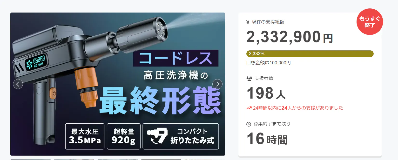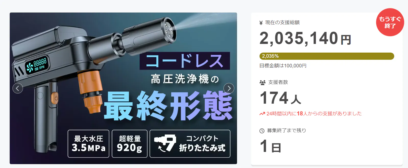 2026/03/21 10:00皆さま、こんにちは。この度は【どこでも、洗える。超軽量×折り畳み×パワフル水圧!常識を覆すコードレス高圧洗浄機】にご支援頂き誠にありがとうございます!皆様の温かいご応援のおかげで、支援総額が200万円を超えました。弊社スタッフとメーカー一同、心から感謝しております。よかったら、SNSでのシェア・拡散をお願い致します。 もっと見る