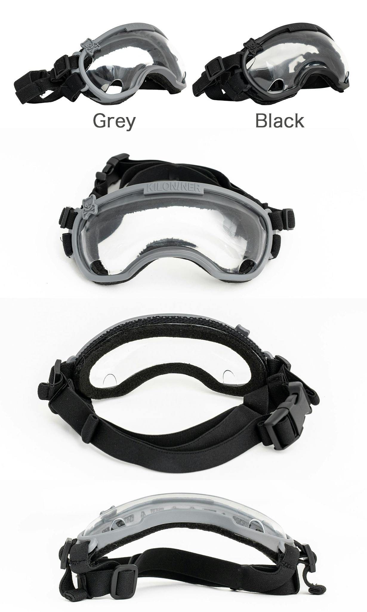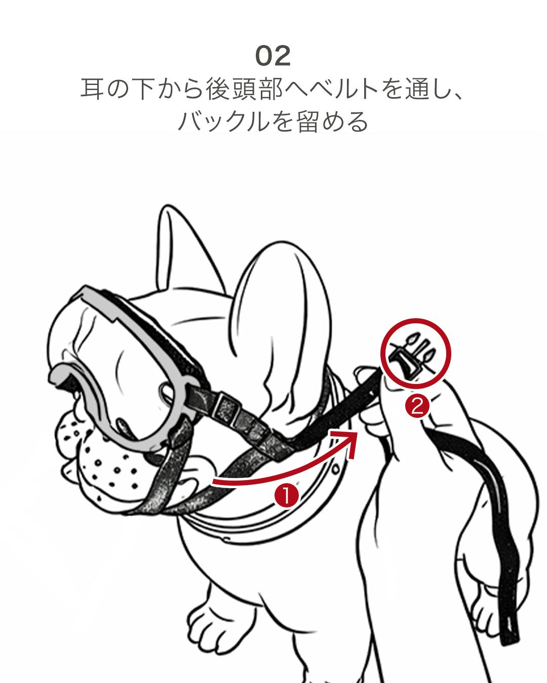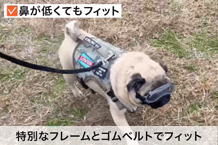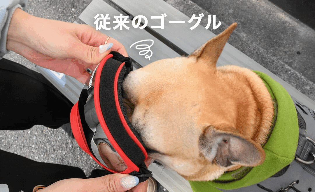 一般的なゴーグルは鼻で支えて装着しますが、短頭犬種はそうはいきません。