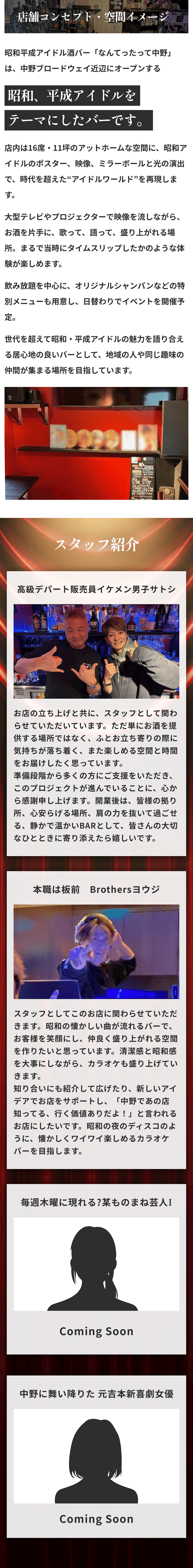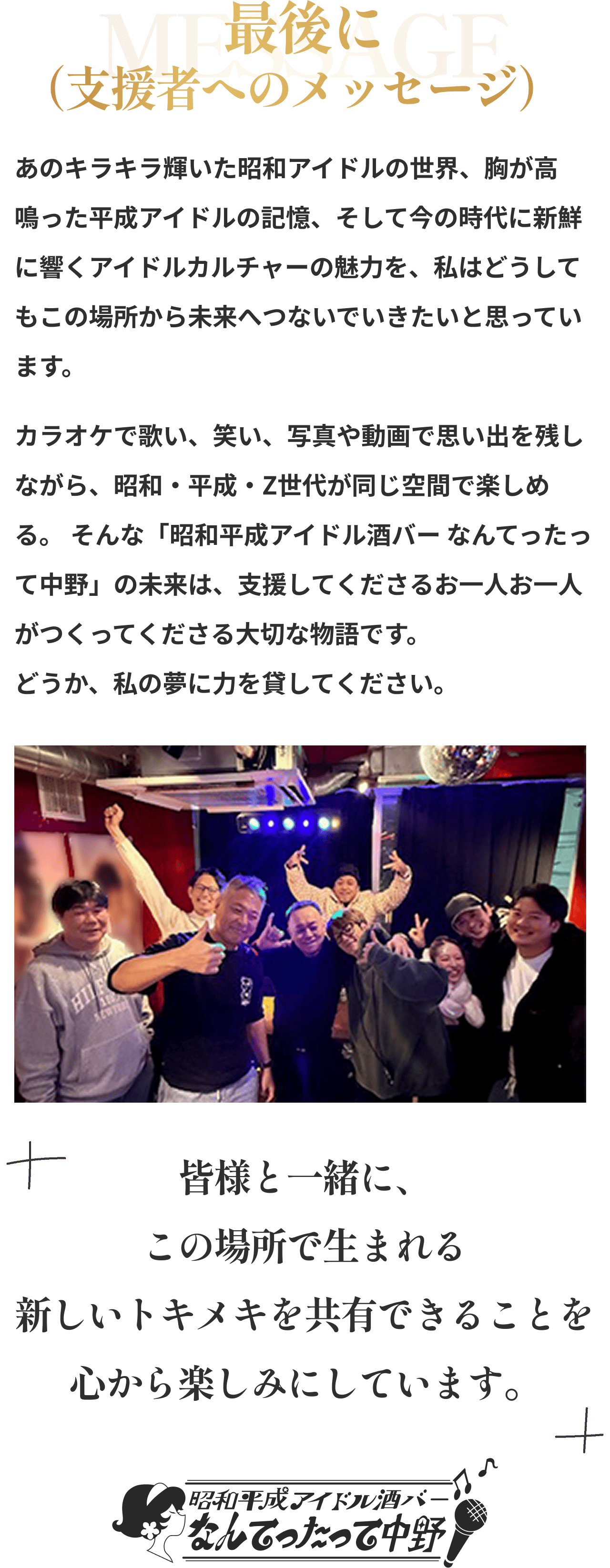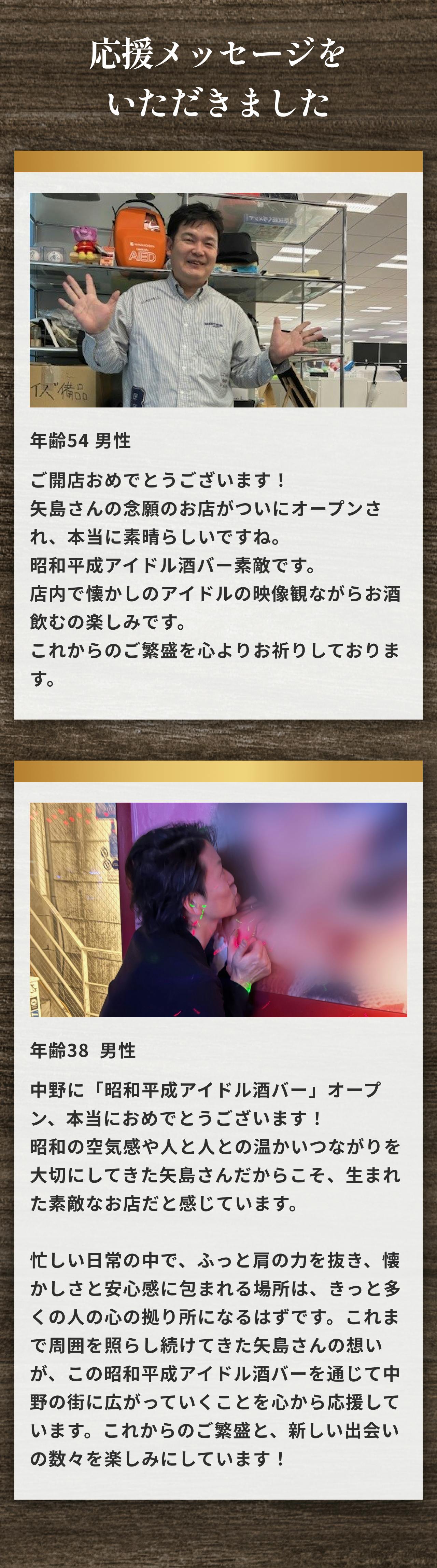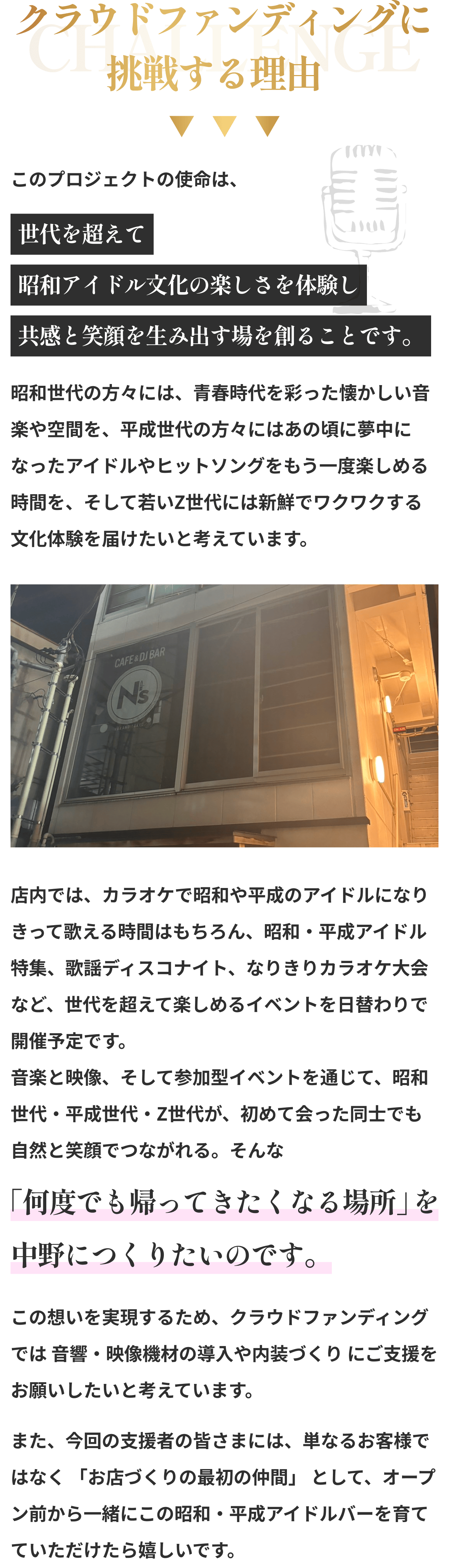 2026/02/09 14:46これまで本プロジェクトを応援してくださっている皆さまそして活動報告を読んでくださっている皆さま、いつもありがとうございます。今回は、2月2日にオープンしたお店の外観と内観について少しご紹介します。写真とあわせて、雰囲気が伝われば嬉しいです。お店はJR中野駅北口から徒歩5分ほどのマガザン中野ビルの2階にあります。写真右の階段を上がると、初めて来られる方は少しだけドキドキするかもしれませんが、店内では、昭和の音楽や映像を楽しめるだけでなく、カラオケで歌いながら盛り上がれるアットホームな空間を提供しています。昭和テイストの内装は、懐かしさを感じていただくだけでなく、思わず写真や動画を撮りたくなる“映える空間”としても楽しめるデザインです。昭和・平成アイドルの空気感を感じながら、自然と会話が生まれるような配置を意識しました。一人で来ても、誰かと来ても、昭和の世界観に浸れる・・そんな空間です。「初めてでも入りやすいですね」と言っていただけたことが、何より嬉しかったです。写真では伝えきれない空気感も、いつか感じていただけたらと思います。支援者の方も、初めての方も、どなたでも歓迎しています。ふらっと立ち寄っていただけると嬉しいです。店舗情報【店名】昭和平成アイドル酒バー なんてったって中野【営業時間】20:00〜2:00【営業日】当面の間、休みなし【住所】東京都中野区中野5-53-5 マガザン中野 2階☆プロジェクトページhttps://camp-fire.jp/projects/919038/view☆リターン一覧はこちらhttps://camp-fire.jp/projects/919038/backers/new もっと見る