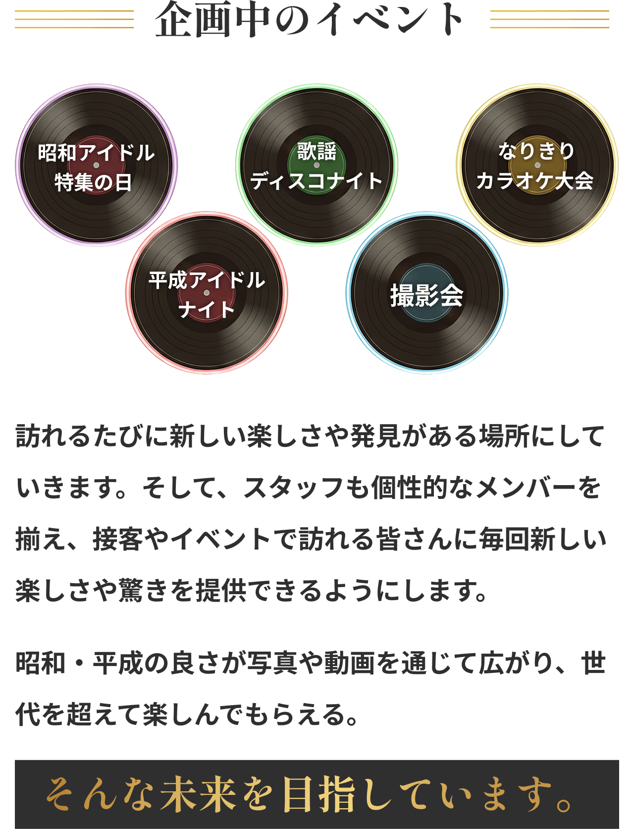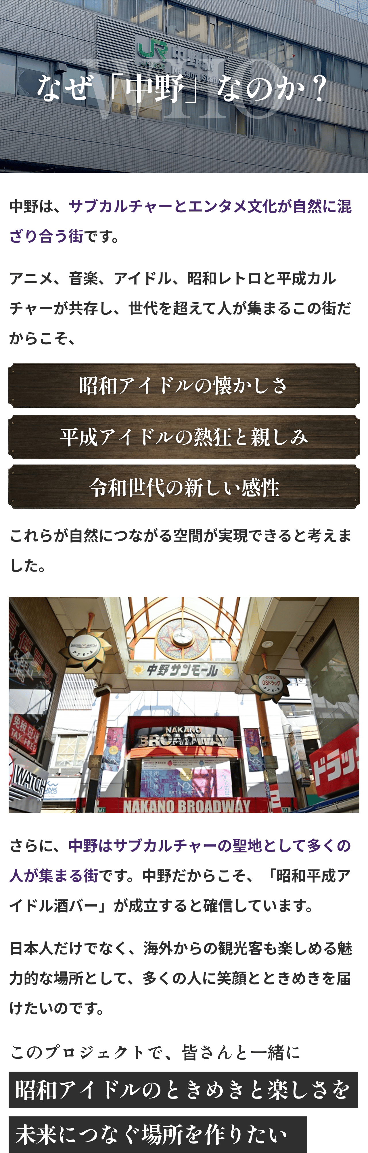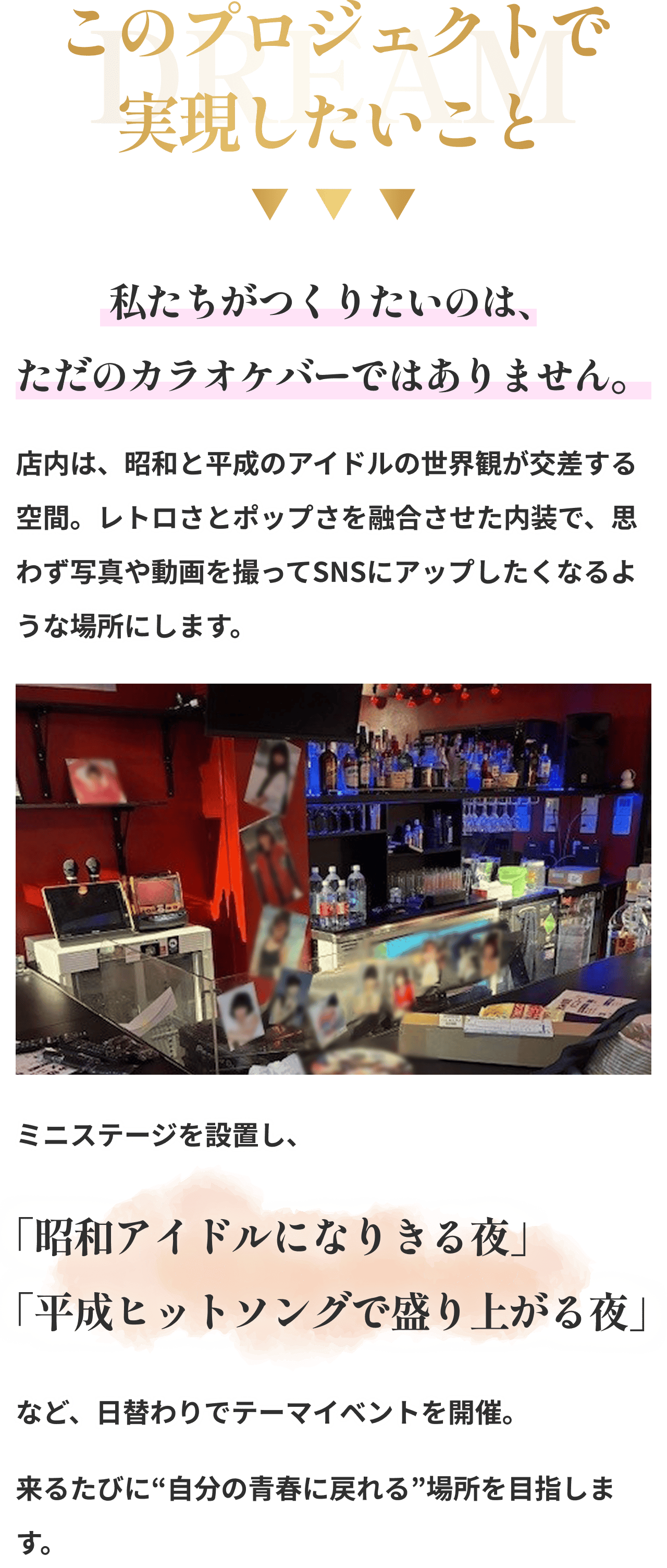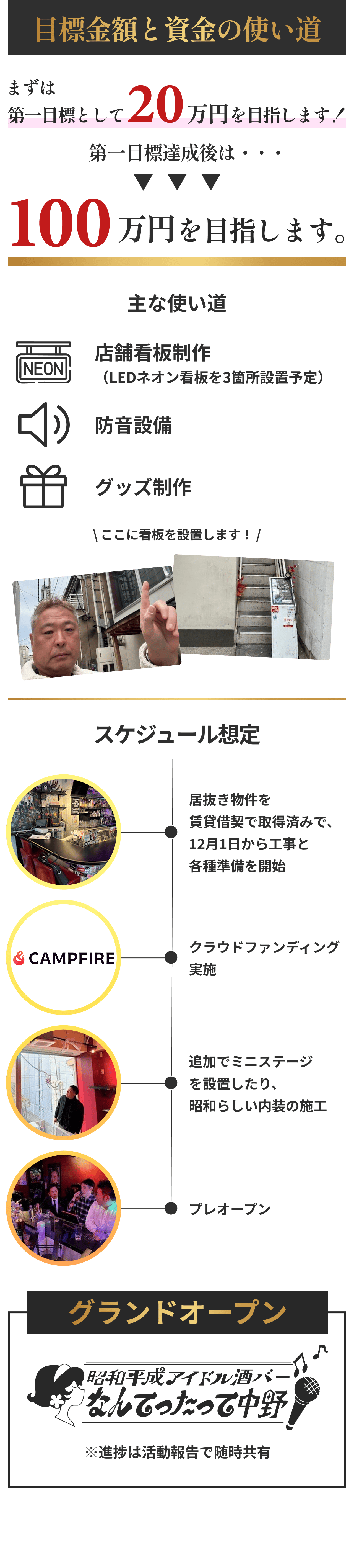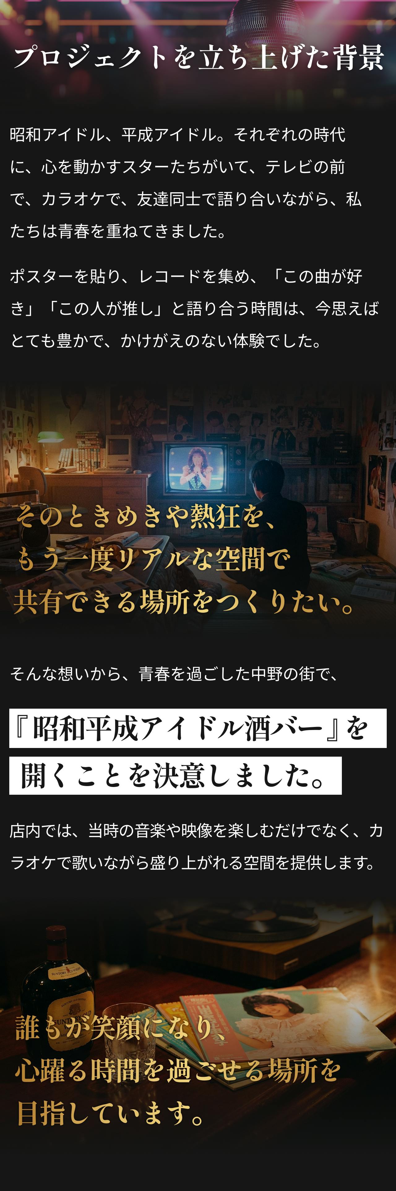 2026/02/09 14:46これまで本プロジェクトを応援してくださっている皆さまそして活動報告を読んでくださっている皆さま、いつもありがとうございます。今回は、2月2日にオープンしたお店の外観と内観について少しご紹介します。写真とあわせて、雰囲気が伝われば嬉しいです。お店はJR中野駅北口から徒歩5分ほどのマガザン中野ビルの2階にあります。写真右の階段を上がると、初めて来られる方は少しだけドキドキするかもしれませんが、店内では、昭和の音楽や映像を楽しめるだけでなく、カラオケで歌いながら盛り上がれるアットホームな空間を提供しています。昭和テイストの内装は、懐かしさを感じていただくだけでなく、思わず写真や動画を撮りたくなる“映える空間”としても楽しめるデザインです。昭和・平成アイドルの空気感を感じながら、自然と会話が生まれるような配置を意識しました。一人で来ても、誰かと来ても、昭和の世界観に浸れる・・そんな空間です。「初めてでも入りやすいですね」と言っていただけたことが、何より嬉しかったです。写真では伝えきれない空気感も、いつか感じていただけたらと思います。支援者の方も、初めての方も、どなたでも歓迎しています。ふらっと立ち寄っていただけると嬉しいです。店舗情報【店名】昭和平成アイドル酒バー なんてったって中野【営業時間】20:00〜2:00【営業日】当面の間、休みなし【住所】東京都中野区中野5-53-5 マガザン中野 2階☆プロジェクトページhttps://camp-fire.jp/projects/919038/view☆リターン一覧はこちらhttps://camp-fire.jp/projects/919038/backers/new もっと見る