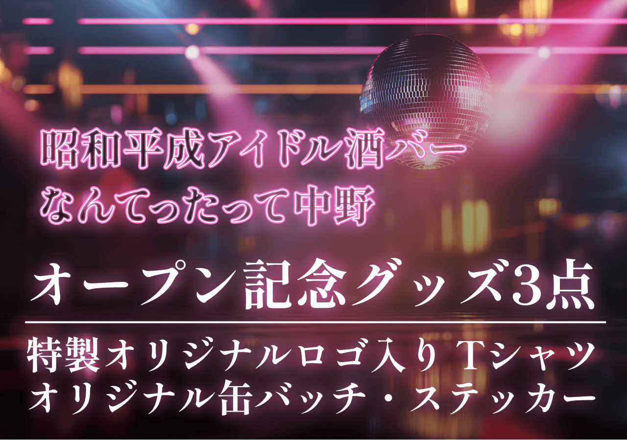 なんてったって中野 オープニング特別体験コース (お店ロゴ入り Tシャツ・オリジナル缶バッジ・オリジナルステッカー ・グループ(4人まで)90分招待券1枚)・オリジナル名刺作成(役職 常連客)100枚 |