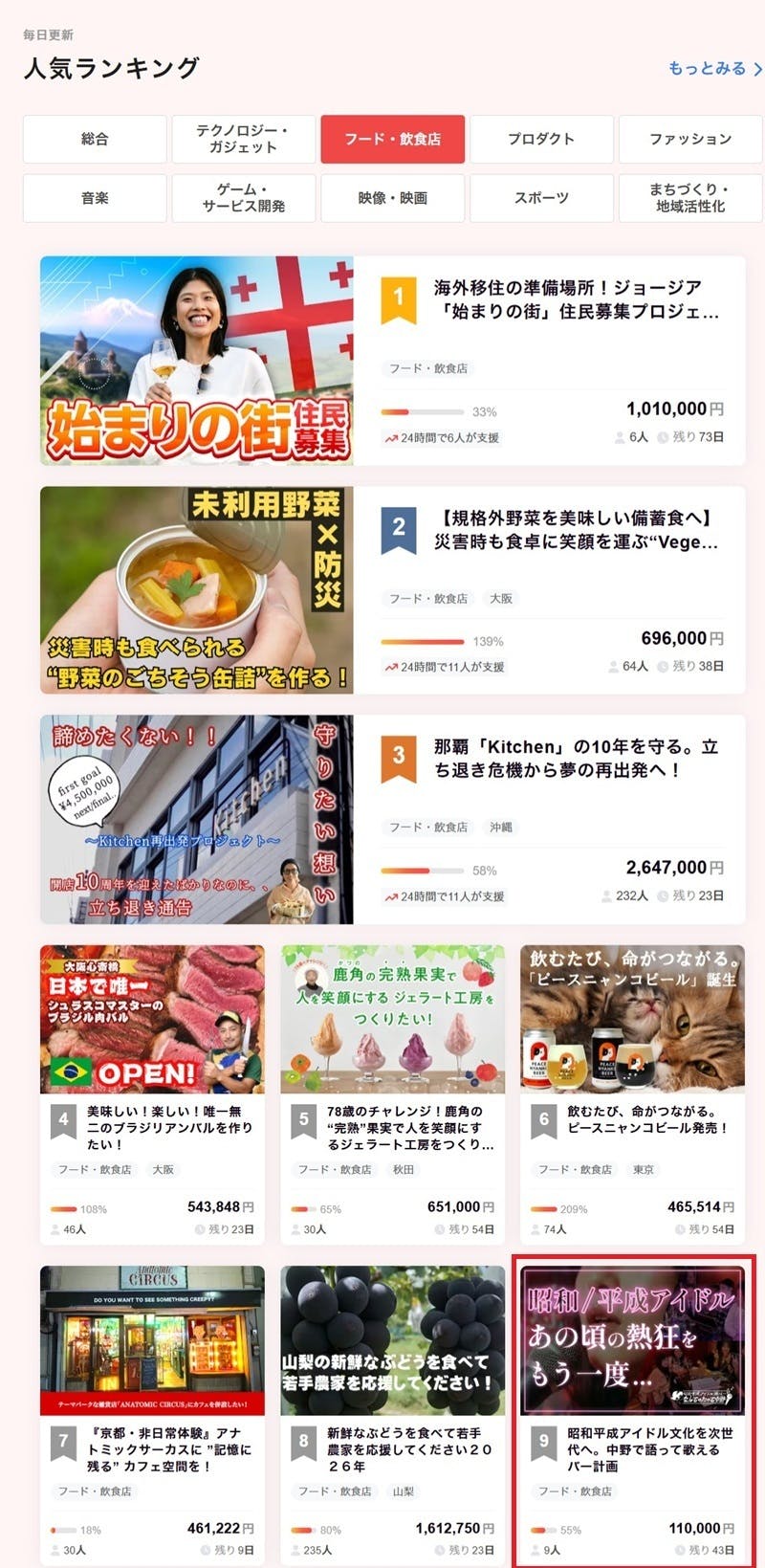 本プロジェクトは 公開3日目にしてフード・飲食店カテゴリの人気ランキング9位 にランクインしました。