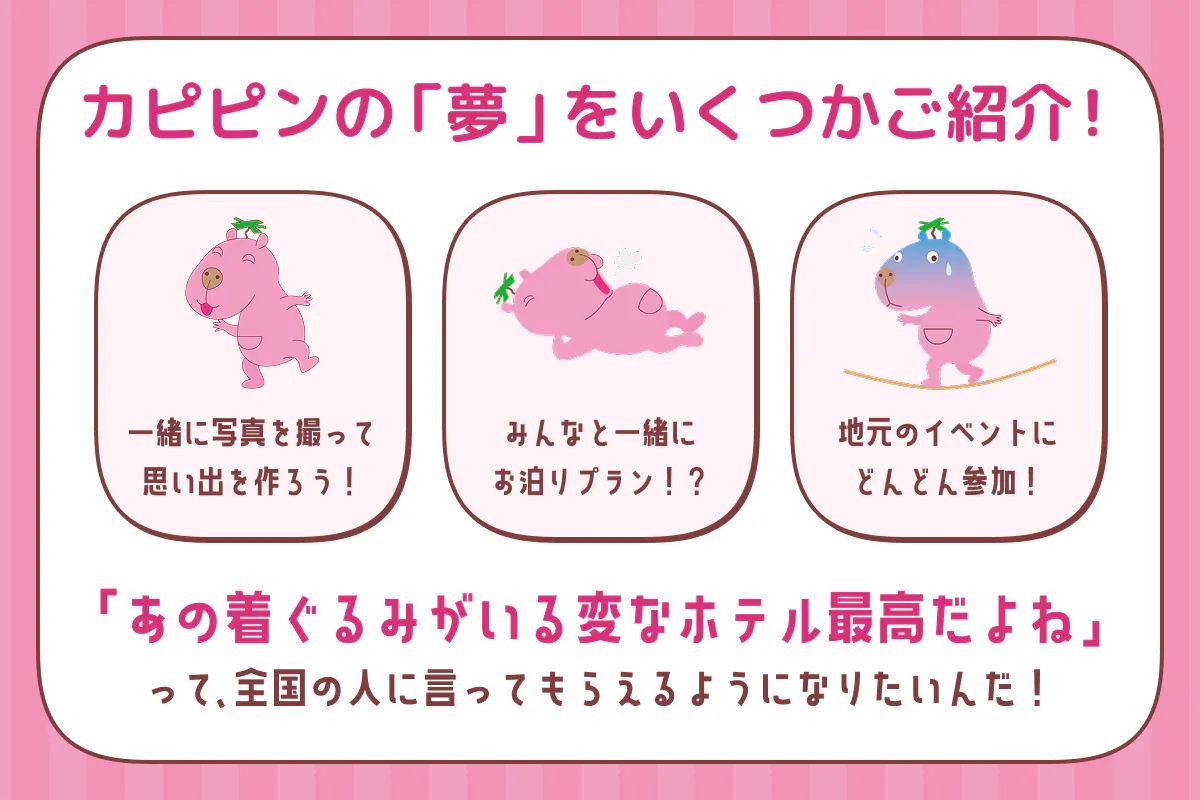 今はまだイラストの中にしかいられないけど、本当はみんなと一緒にサウナの話をしたり、ホテルのロビーでお出迎えしたり、地域のイベントでダンスしたりしたいんだ。 大手チェーンのホテルにはない、『おもしろくて温かい時間』を、カピピンが先頭に立ってみんなに届けたいピンよ!