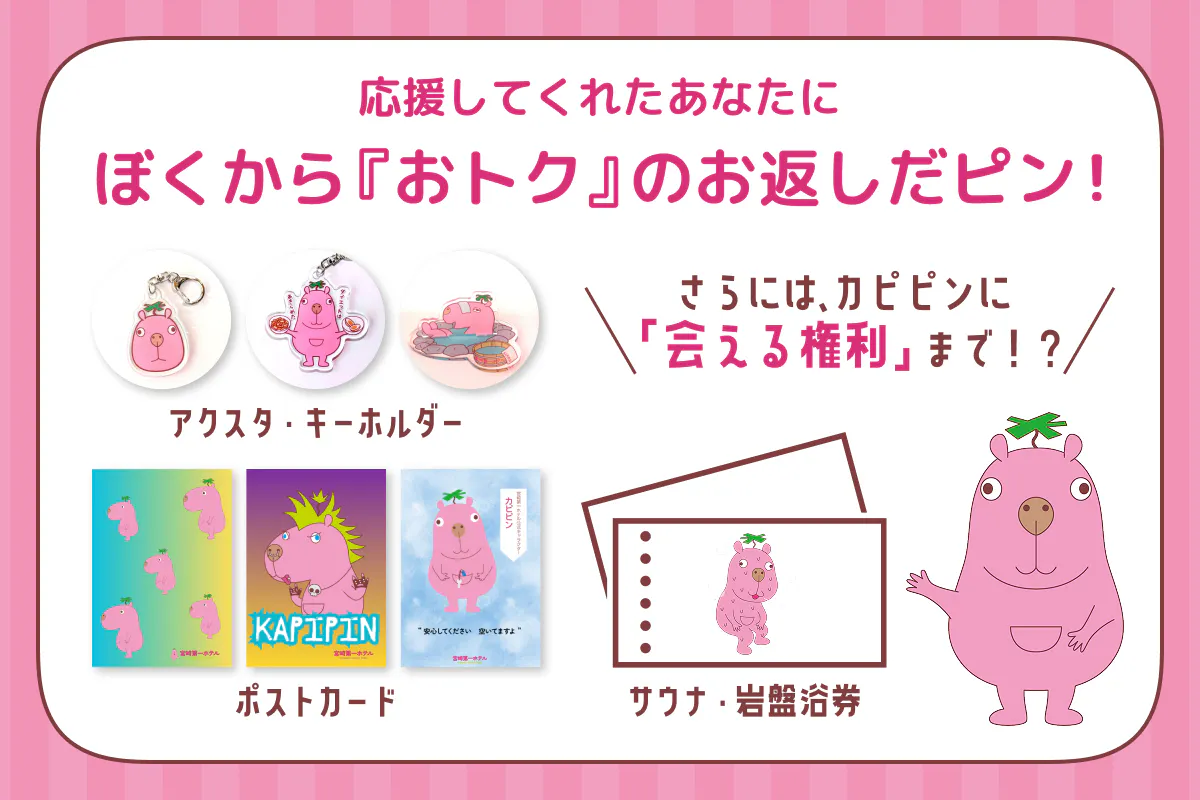 カピピンのアクリルキーホルダーやアクリルスタンド、ポストカードなどのグッズや、宮崎第一ホテルの男性専用大浴場・女性専用岩盤浴が使用できる施設利用券、協賛企業 青井岳温泉の入浴券などお得なリターンをたくさん準備しています。