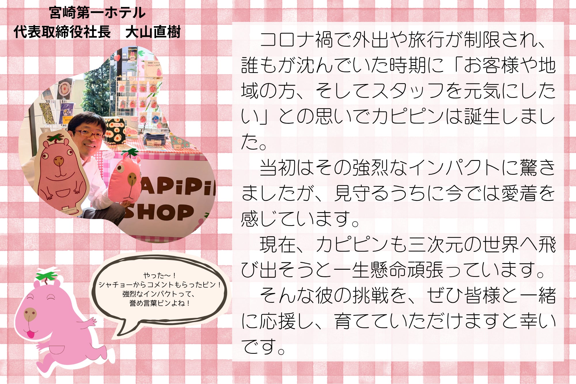 【SNSで応援!】 公式Instagramでも随時情報を発信中!「#カピピン」で拡散してくださると、カピピンが飛んで喜びます! ➡ 宮崎第一ホテル 公式Instagram