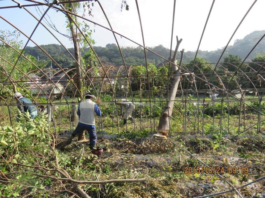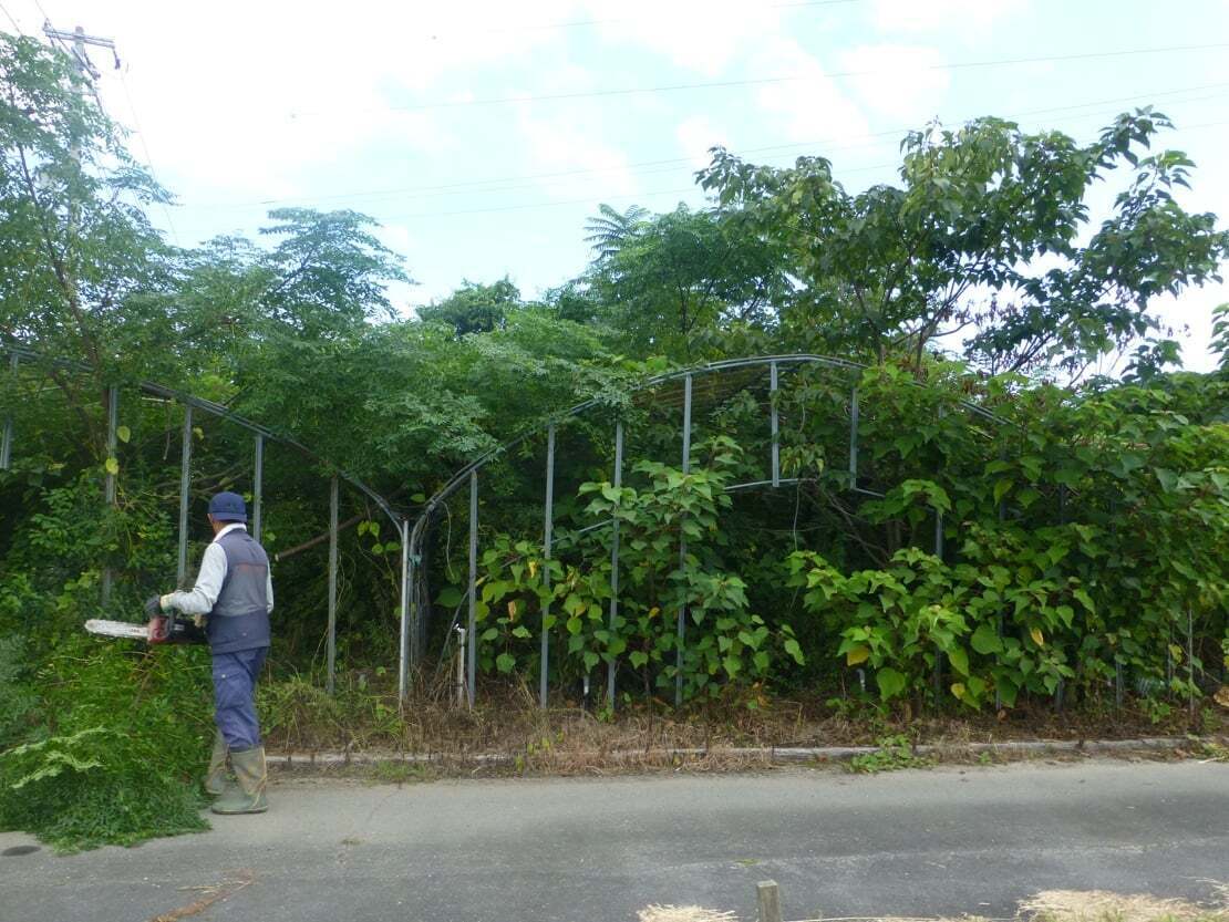 15年の前の状態: かつてのイチゴ用ビニールハウスが廃墟と化し、雑草・雑木が人の胴体ほどの太さにまで成長していました。