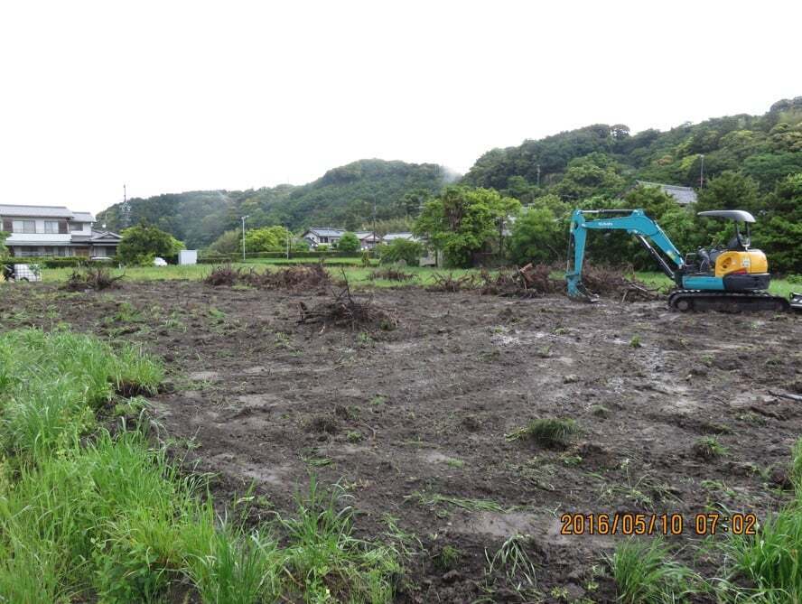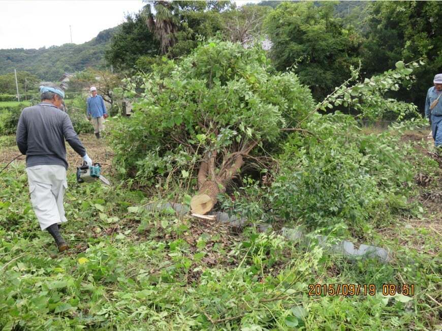 10ヶ月の死闘: 岩田故郷の会の皆さんが集まり、構造物を解体し、絡まり合ったツルを一本ずつ切り、ユンボで抜根。更地に戻すまでに10ヶ月近い歳月を要しました。