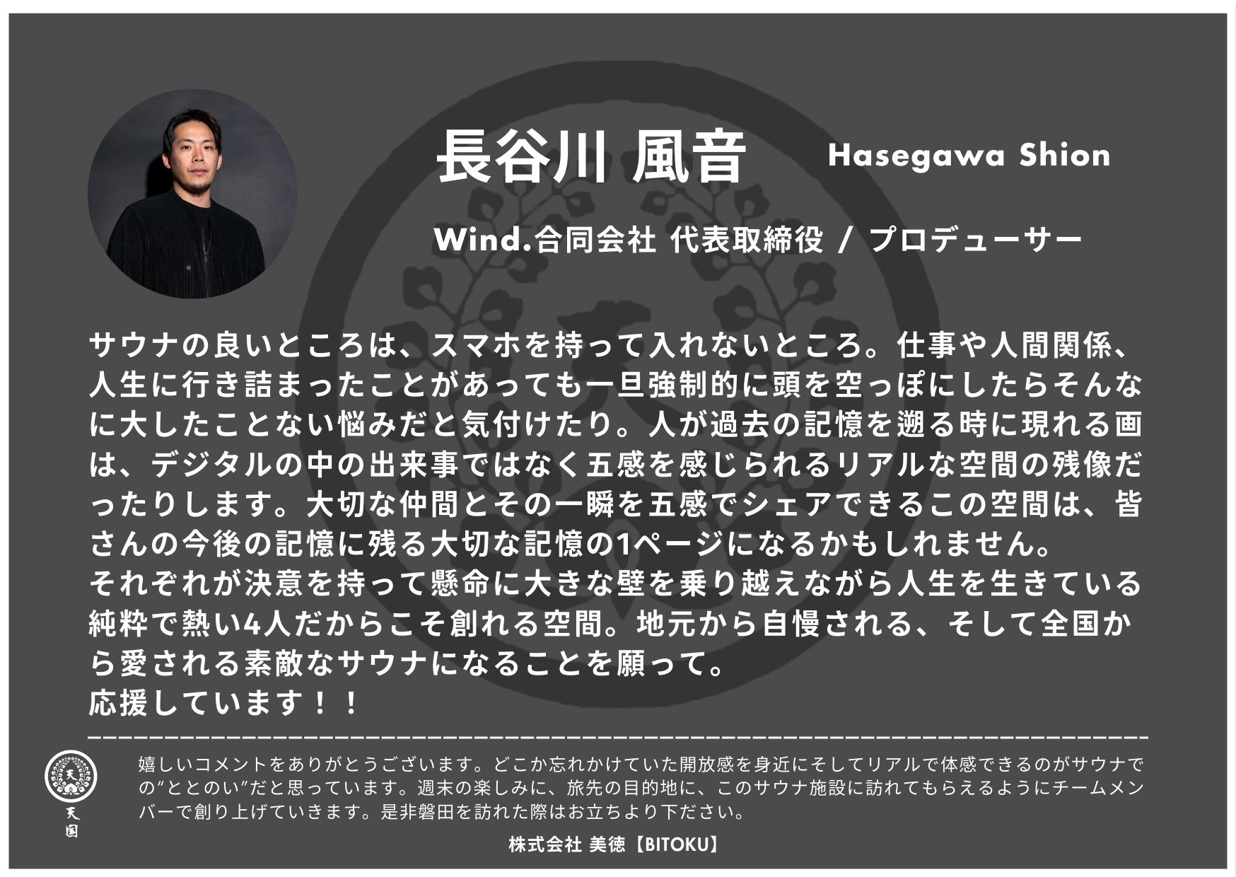 【天国サウナ】アドバイザーの花岡様より 応援メッセージをいただきました