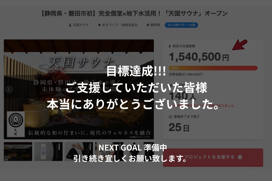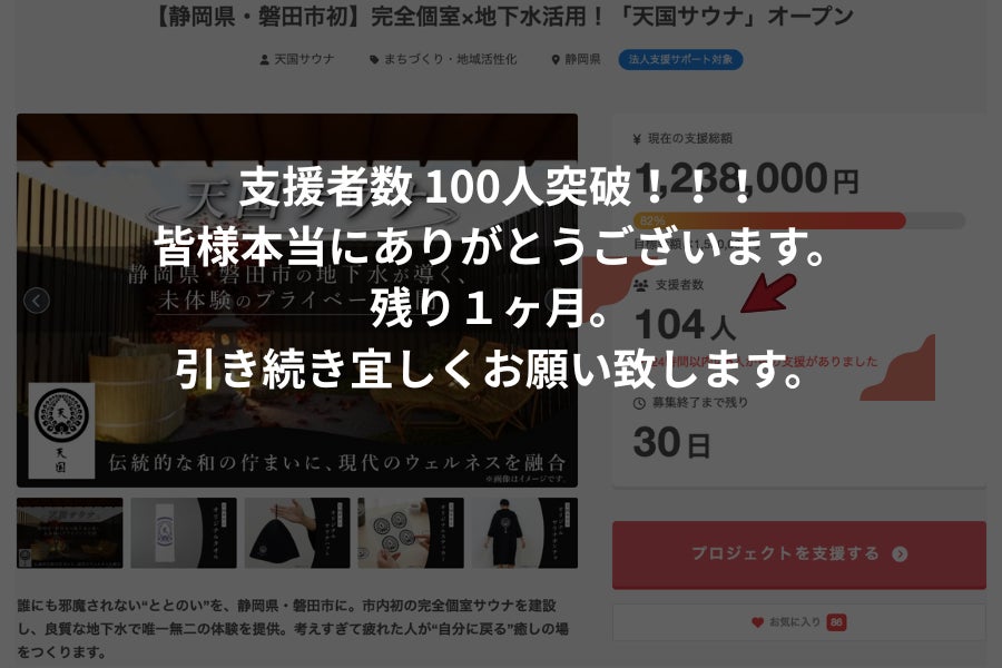 2026/04/01 12:00支援者数100人突破!!!ご支援いただいた皆様本当にありがとうございます。公開開始から10日で100人以上の方にご支援をいただきました!私たちのプロジェクトにこんなにも多くの方が興味、関心、そして支援までしていただけて、スタッフ一同心から感謝しています。また、◻︎磐田を支える皆さんに感銘を受けました! 応援しています!頑張ってください!◻︎待ちきれないです!今から外で並んで待ってまっす!!◻︎応援しています!頑張ってください! また地元に帰った時寄らせていただきますね◻︎地元にプライベートサウナができるなんてとても嬉しいです。 応援しています!頑張ってください! 、、、など県内外からたくさんの応援コメントもいただき、私たちの大きな励みとなっております。クラウドファンディングはこれからも続き、私たちもより一層多くの方に磐田初のプライベートサウナの存在を届け、支援の輪がもっともっと大きくなるように努めて参ります。4月に入り、残り1ヶ月。引き続き皆様にはこのプロジェクトを見守っていただき、成功を一緒にサポートしていただけたら幸いです。どうぞ、天国サウナを宜しくお願い致します。株式会社 美徳 【BITOKU】目標金額達成のためプロジェクトのシェア等、支援者様のさらなるご協力をしていただけますと幸いです。こちらのリンクをシェアいただければと思います。https://camp-fire.jp/projects/919077/view もっと見る