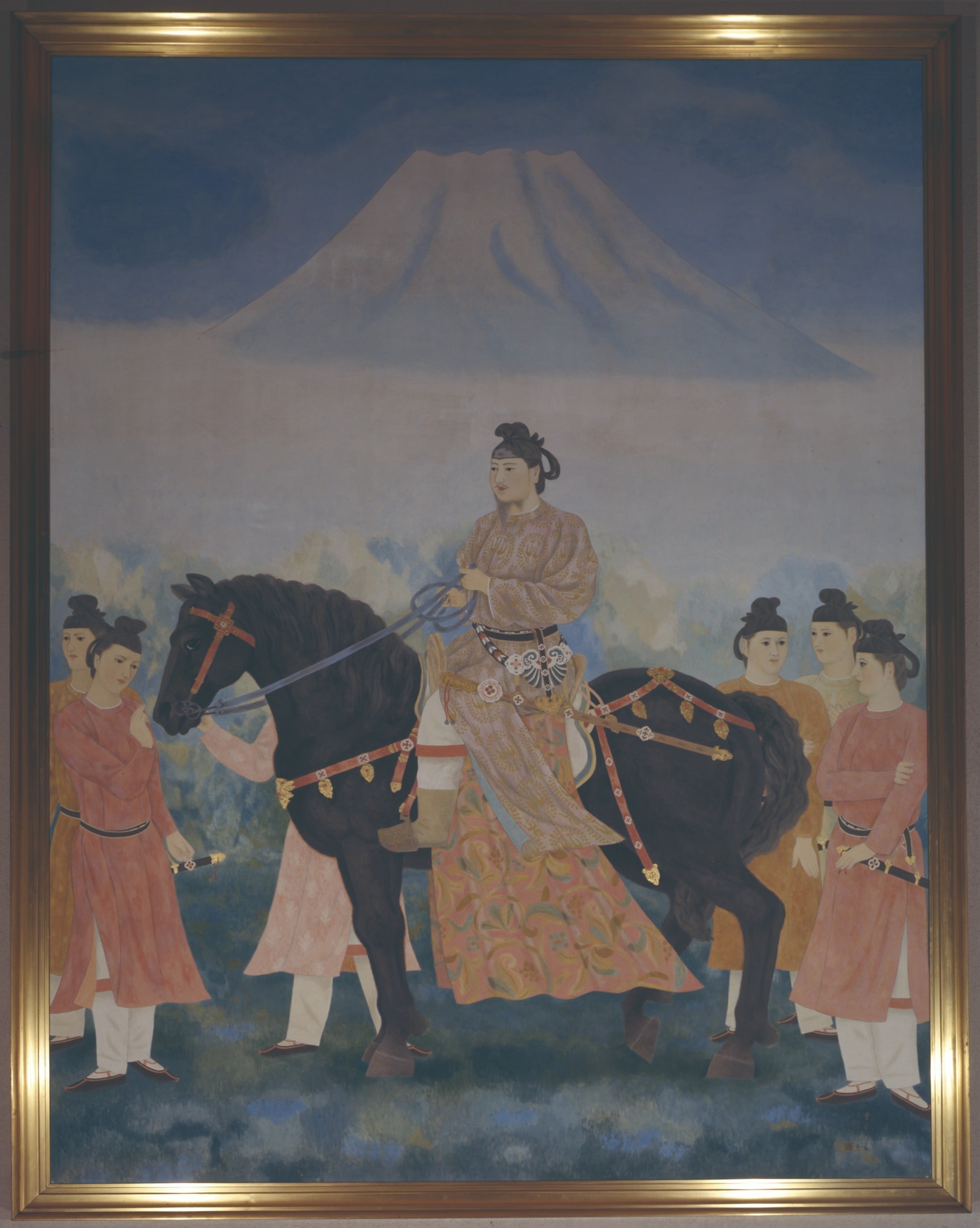 一辺の長さが280㎝×295㎝という巨大な三枚の壁画の内容を聖徳太子の生涯を象徴する<太子誕生><憲法制定><太子巡国>の三部作としました。壁画の制作にかかりますと、印象の心、精神は聖徳太子に入り込み、太子と聖堂ですごすような境地であったろうと思われます。