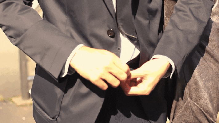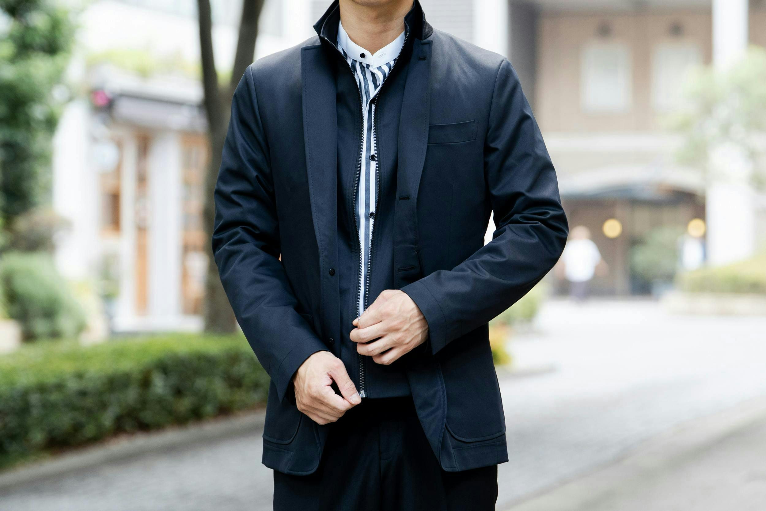 ボタンが見えないようにすることで、よりすっきりとしたミニマルな装いになります。 普通のジャケットにはない上質さがありますので、見た目が軽すぎず、コートのような重厚感も醸し出せます。