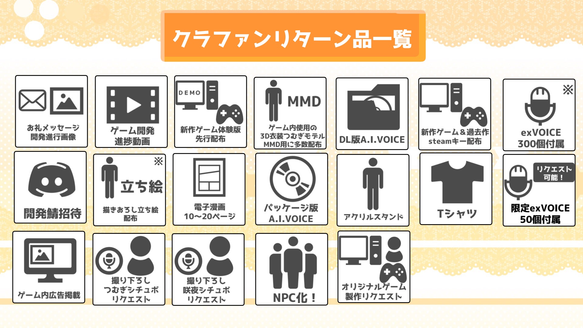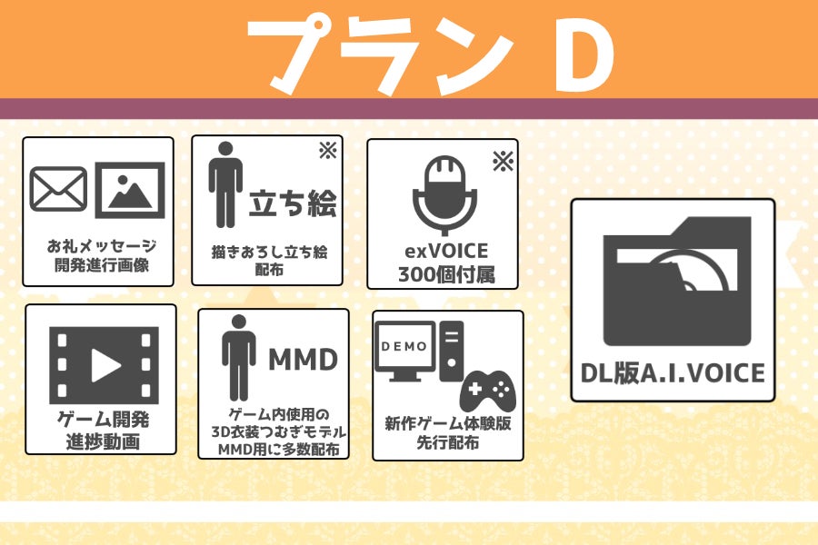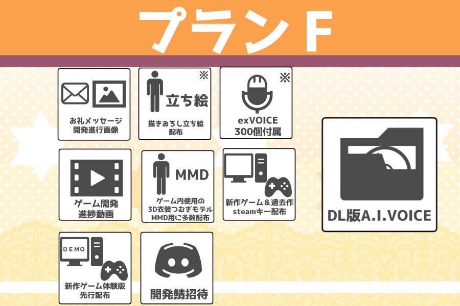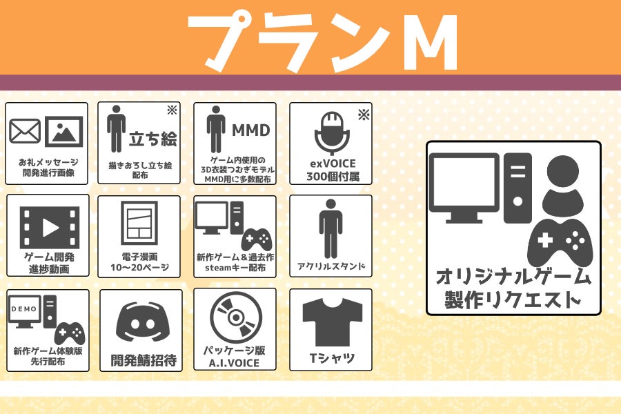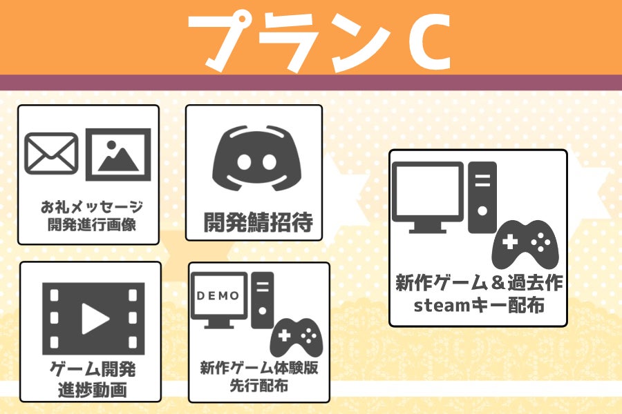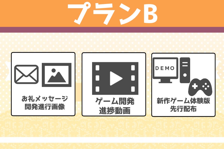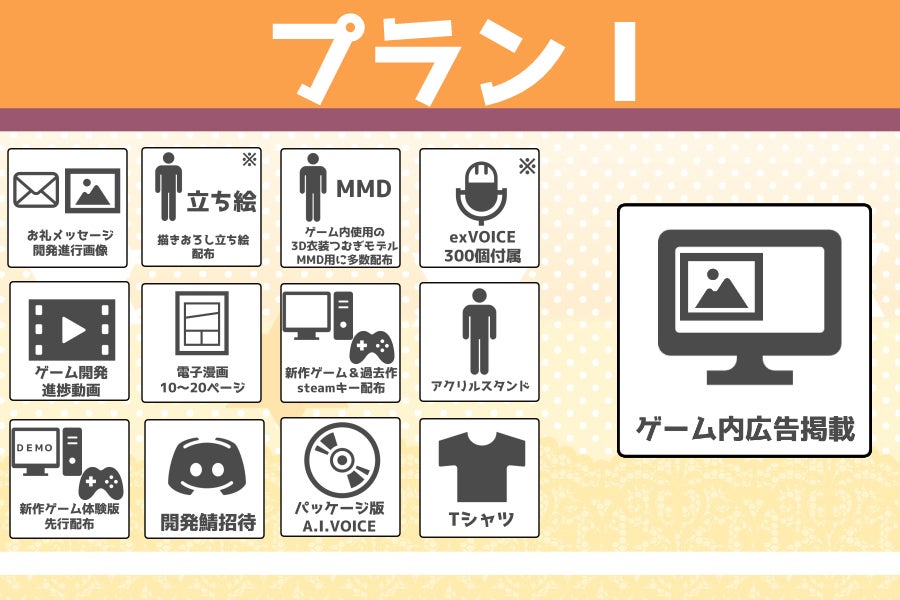 延期や遅延が想定されるリターン品は新作ゲームに関するプラン全般となります。