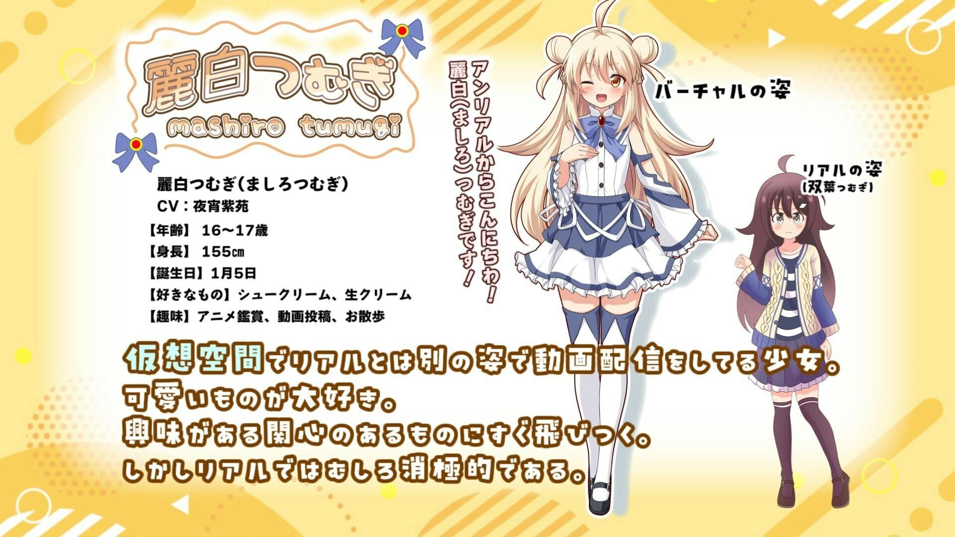 本作は、フルダイブ型メタバース空間「Unreally」を舞台に、プレイヤーが主人公「麗白つむぎ」となって、もうひとつの人生を歩む**「箱庭メタバーススローライフ × VTuberシミュレーション」**ゲームです 。「配信・写真投稿・交流・家具デコ」など、自由な活動を通して、あなただけの夢のVTuberライフを送ることができます 。