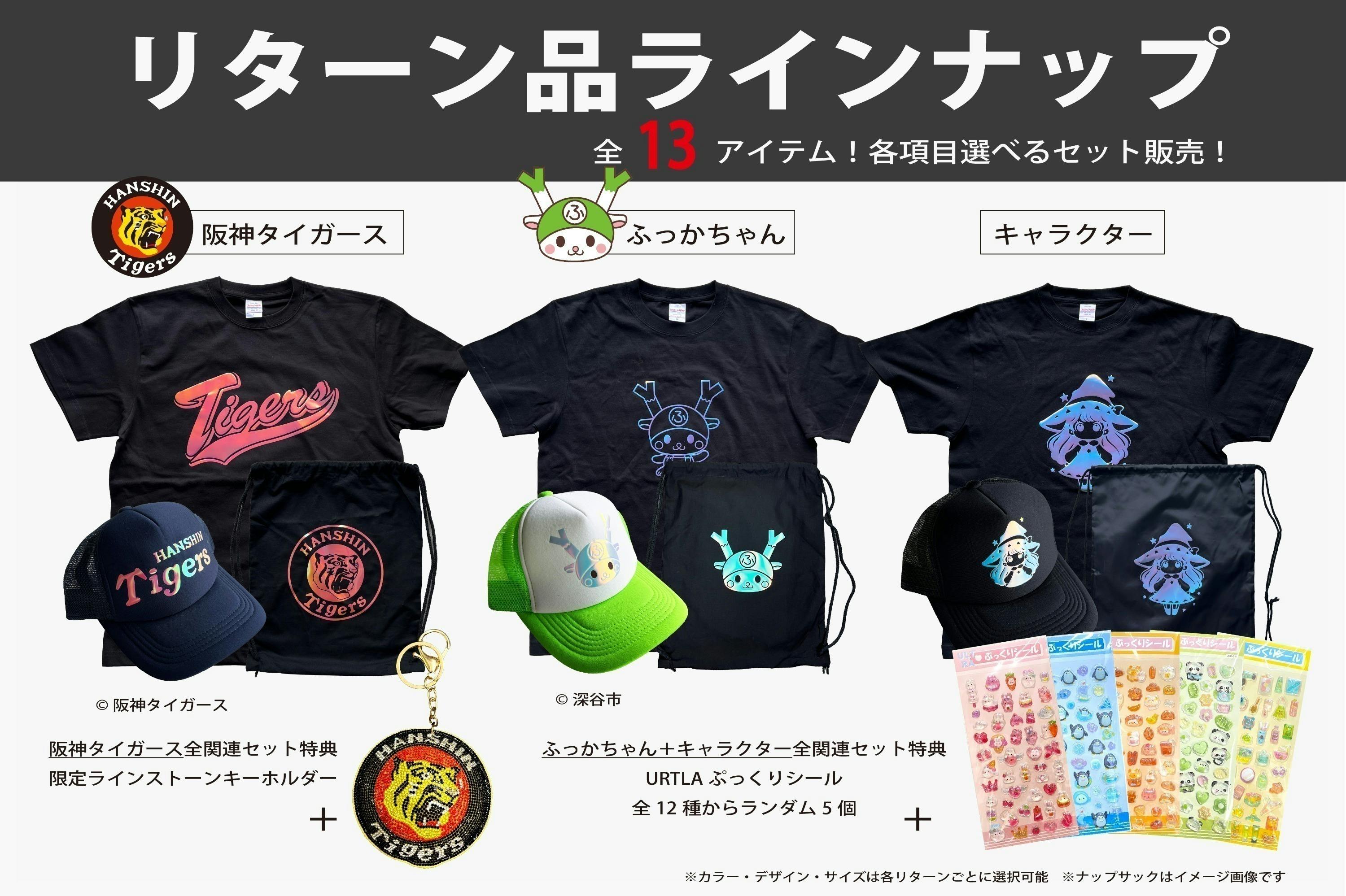 支援していただいた皆様には、新素材を使用した様々なアイテムをご用意しています。阪神タイガース版、ふっかちゃん版、キャラクター版など複数のデザインからお選びいただけます。