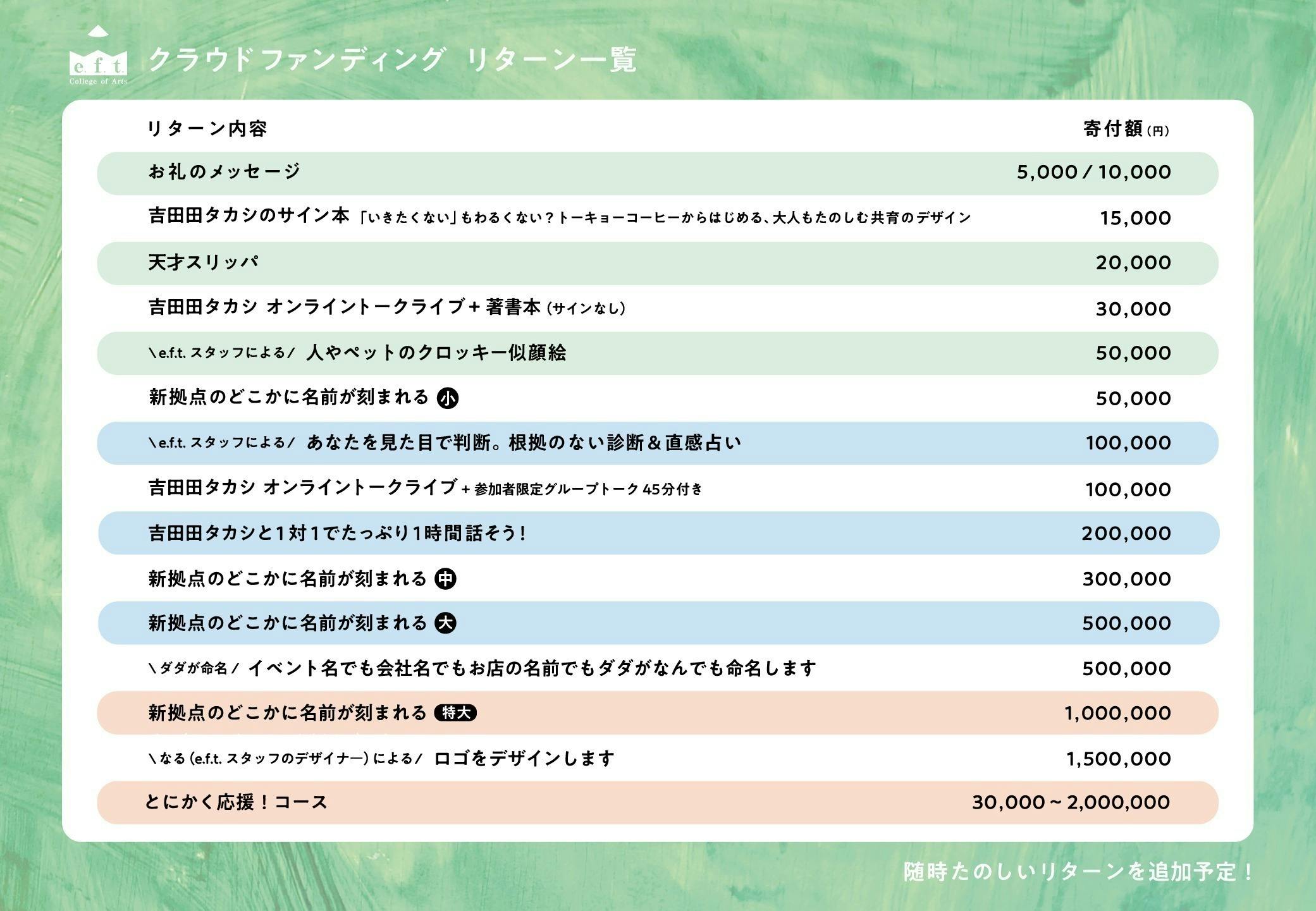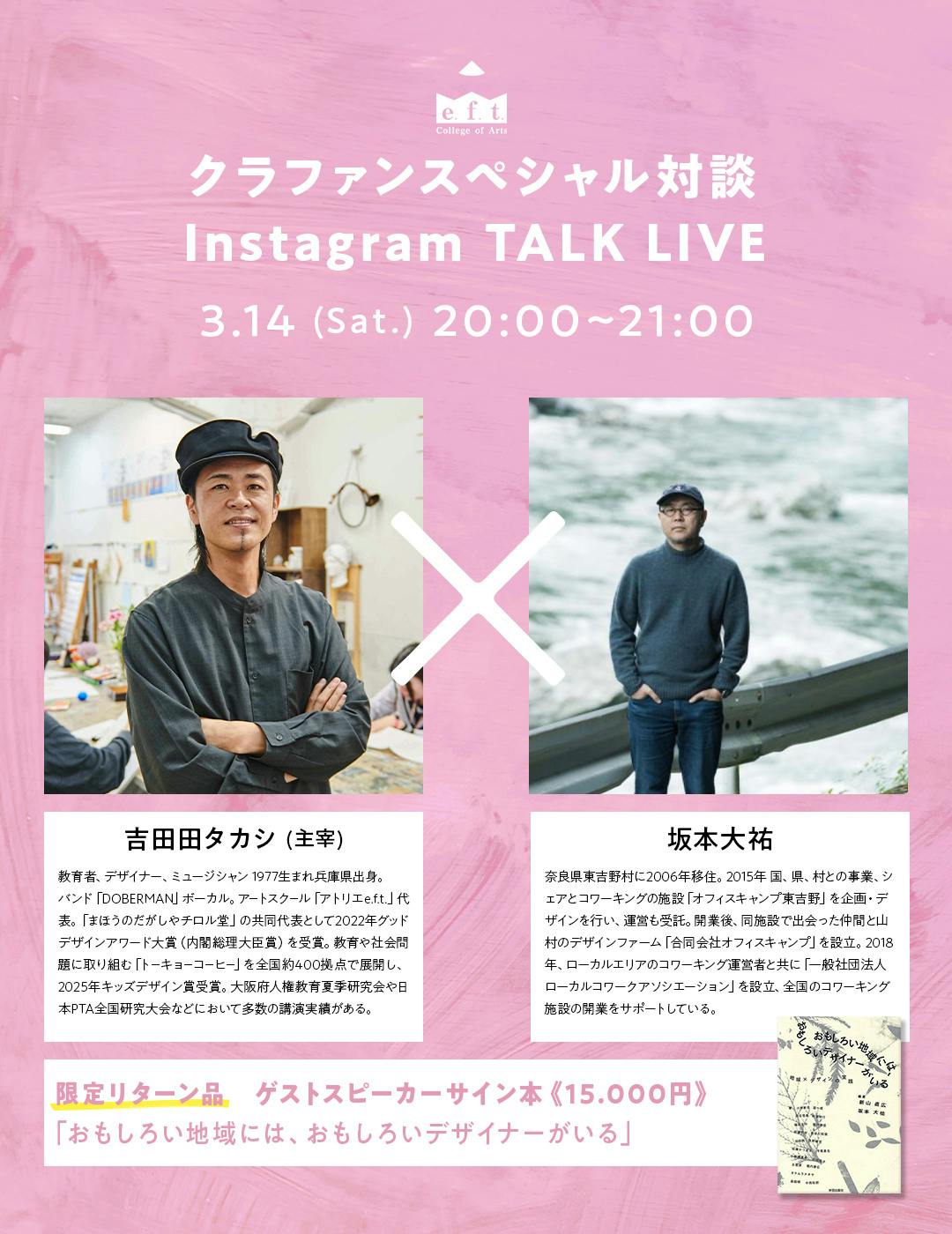 2026/03/11 20:05\クラファンスペシャル対談を開催します!/3月14日(土)20:00〜、Instagram LIVEで、奈良・東吉野村で地域とデザインをつなぐ活動を続けている坂本大祐さんをゲストにお迎えします。「おもしろい地域」はどうやって生まれるのか。そして、e.f.t. College of Artsが目指す“地域に開かれた学び”はどんな未来をつくるのか。ここでしか聞けないリアルな話を、ぜひ一緒に聞いていただけたら嬉しいです。さらに今回のクラウドファンディング限定で、坂本さんのサイン本「おもしろい地域には、おもしろいデザイナーがいる」をリターンとしてご用意しました。お気に入り登録してくださっている皆さん、そして応援してくださっている皆さんと一緒に、このプロジェクトの未来を考える時間にできたら嬉しいです。ぜひ事前にシェア&当日のご参加、お待ちしています!インスタライブは吉田田タカシのインスタグラムからお入りください!https://www.instagram.com/yoshidadatakashi/?hl=ja もっと見る