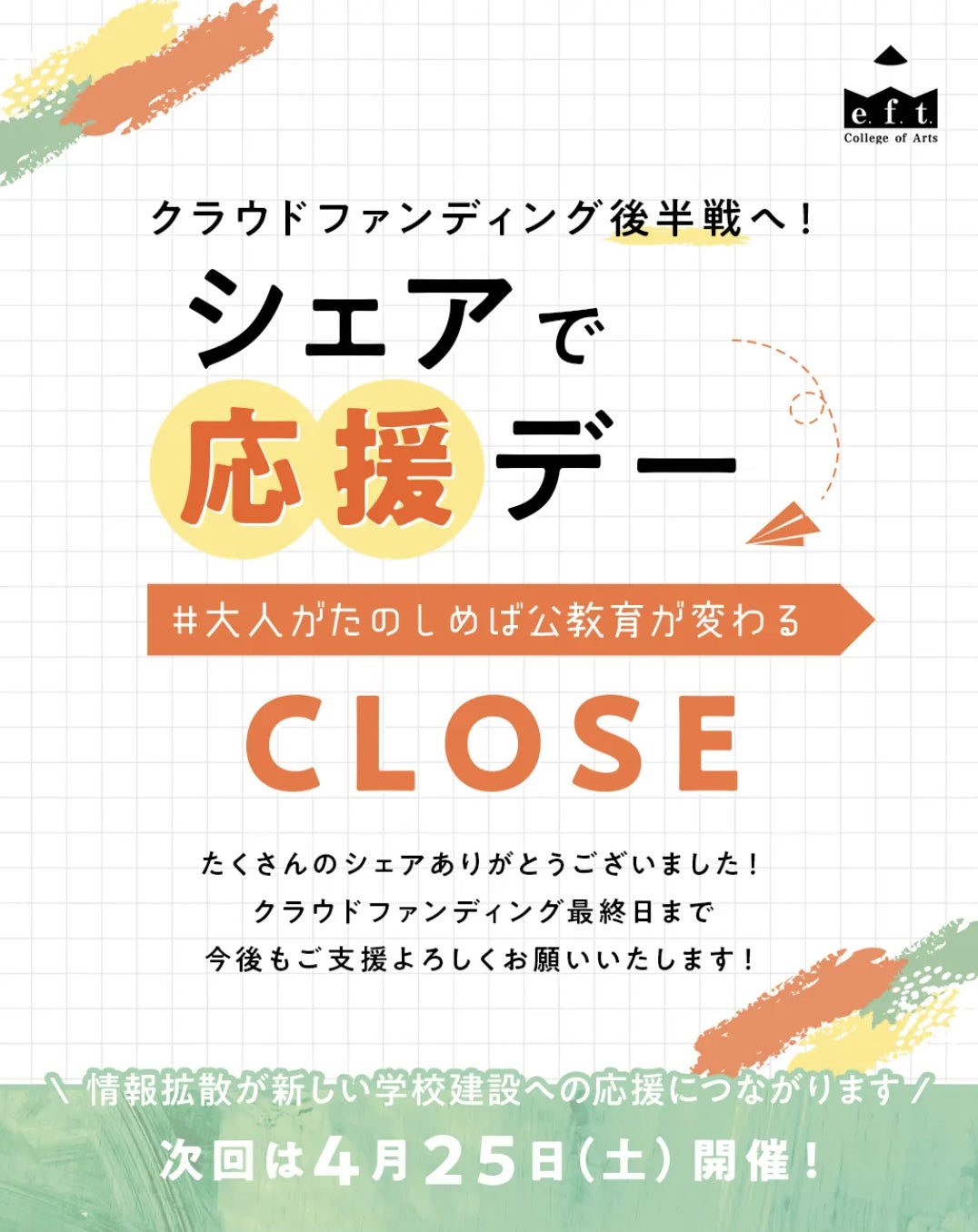 このクラファンは5月14日までですが、あと2回、シェアで応援デーを開催します。