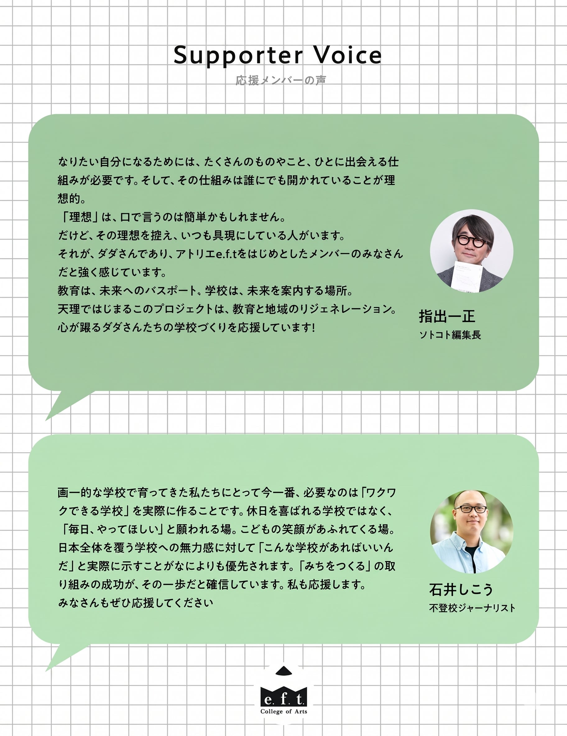 2026/04/19 07:00おはようございます。関西はすっかり初夏の様相ですが皆さんのところはいかがでしょうか?今日は応援メンバーの声第三弾、最終回。ソトコト編集長の指出さんと、不登校ジャーナリストの石井しこうさんからのメッセージです───ソトコト編集長 指出 一正 様なりたい自分になるためには、たくさんのものやこと、ひとに出会える仕組みが必要です。そして、その仕組みは誰にでも開かれていることが理想的。「理想」は、口で言うのは簡単かもしれません。だけど、その理想を捉え、いつも具現にしている人がいます。それが、ダダさんであり、アトリエe.f.tをはじめとしたメンバーのみなさんだと強く感じています。教育は、未来へのパスポート。学校は、未来を案内する場所。天理ではじまるこのプロジェクトは、教育と地域のリジェネレーション。心が躍るダダさんたちの学校づくりを応援しています!───不登校ジャーナリスト 石井 しこう 様画一的な学校で育ってきた私たちにとって今一番、必要なのは「ワクワクできる学校」を実際に作ることです。休日を喜ばれる学校ではなく、「毎日、やってほしい」と願われる場。こどもの笑顔があふれてくる場。日本全体を覆う学校への無力感に対して「こんな学校があればいいんだ」と実際に示すことがなによりも優先されます。「みちをつくる」の取り組みの成功が、その一歩だと確言しています。私も応援します。みなさんもぜひ応援してください。───私たちが作る学校は、たくさんの大人が集まる場所にもなるので、いろんな選択肢を提示できると思いますし、訪れた方に「こんな学校があればいいんだ!」という発見を提供できるようにしていきたいです!アトリエe.f.t. College of Artsの開校は2027年4月、クラウドファンディングは5月14日まで!次回の「シェアで応援デー」4月25日です。ぜひご協力お願いします! もっと見る