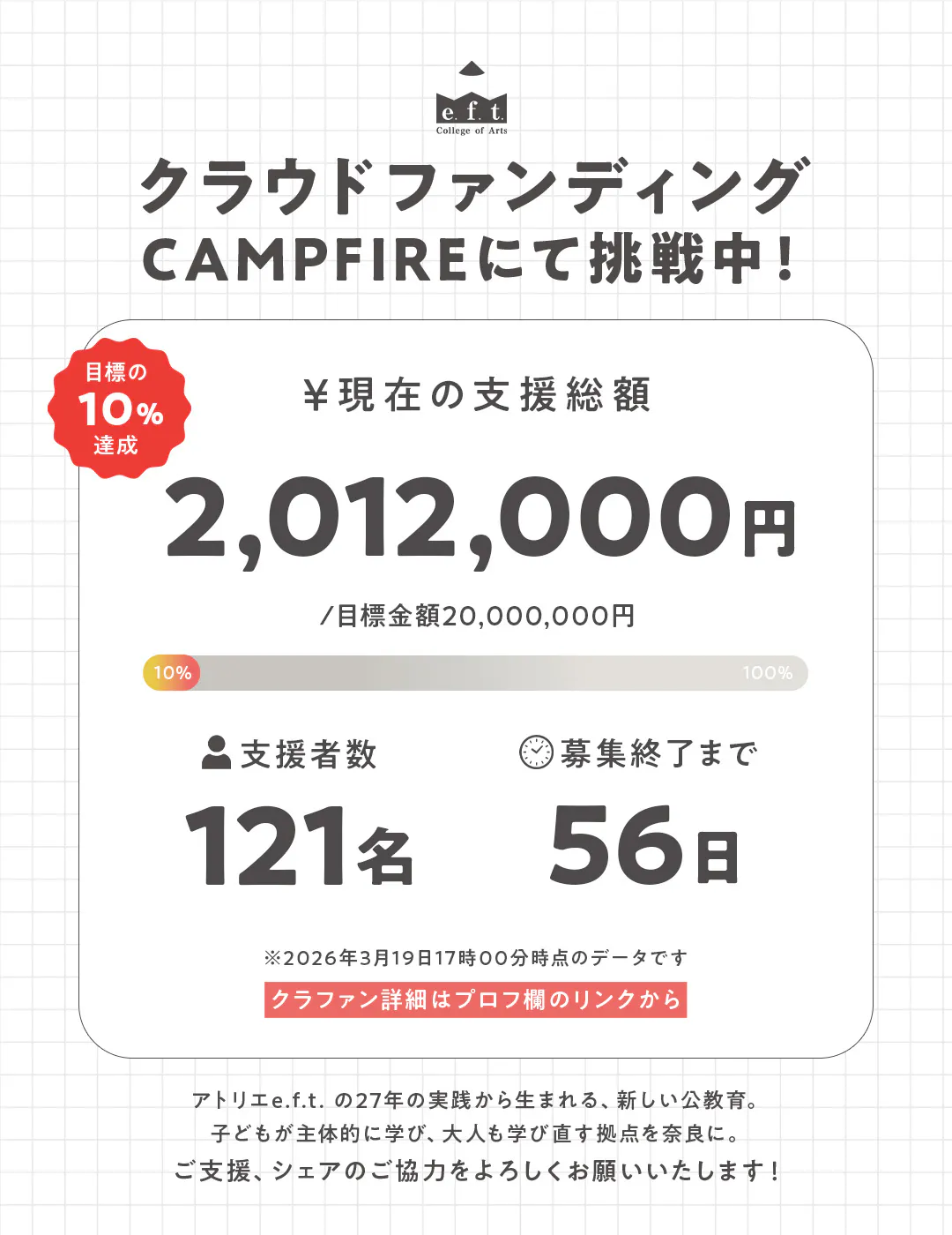 2026/03/14 20:29こんにちは!アトリエe.f.t.です!クラウドファンディングに《2,000円》の新しいリターンを追加しました!e.f.t. college of Artsのオリジナルスマホ壁紙をお届けします。「少額でも応援したい」そんな声にお応えして用意しました。2,000円から、この挑戦に参加できます。ぜひ応援のほどよろしくお願いいたします。《クラウドファンディング概要》期間:2026年2月24日(火)21:00〜2026年5月14日(木)https://camp-fire.jp/projects/919324/view目標金額:2,000万円校舎修繕費や子供たちの学びのための備品購入に充てられます。 もっと見る