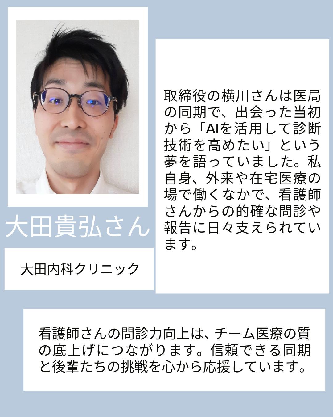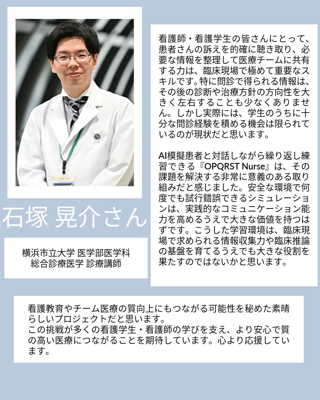 • おはようございます!OPQRSTです。クラウドファンディングを始めてから、思っていなかったところからメッセージが届くことがあります。今回紹介したいのは、その中でも少し驚いた応援です。ニューヨークの Icahn School of Medicine at Mount Sinai / Mount Sinai Morningside and West で内科医として働いている 福澤文駿さん からメッセージをもらいました。メッセージはこちらから福澤さんとは、日本で総合診療に関わっていた頃の仲間です。いまはアメリカの臨床の最前線にいます。Mount Sinai は世界中から医師が集まる医療機関で、臨床だけでなく研究や教育の面でも存在感の大きい場所です。そんな場所で働いている人から、このプロジェクトに言葉をもらえるとは思っていませんでした。国が違っても同じこと「問診力」日本で一緒に働いていた頃、診療が終わったあとに福澤さんとよくしていた話があります。「この患者さんは、なぜ今日ここに来たんだろう」検査結果をどう読むか、という話ではありません。患者さんが何を困っていて、何を求めて受診したのか。その背景をどう理解するか、という話です。今回のメッセージの中でも、福澤さんは同じことを書いてくれていました。医療制度も言語も違う場所で診療していても、患者ケアの質を大きく左右するのはやはり 「問診力」 だということです。検査や医療技術は国によってかなり違います。検査機器も、医療制度も、診療の流れも違う。それでも、患者さんの話を丁寧に聞くことの価値は変わらない。そこは日本でもアメリカでも同じだということです。学び続けることを支えること福澤さんはいま、臨床と並行して AIと医学教育の分野の研究 にも関わっています。その立場から、AIをうまく使いながら学び続ける医療者がこれからの医療を支えていく、というメッセージも書いてくれていました。私たちが取り組んでいる AI問診シミュレーション OPQRST Nurse も、まさにその「問診を学び続ける環境」を作ろうとする試みです。遠く離れたニューヨークの病院で働いている仲間が、同じテーマについて考えている。それを知ると、この取り組みは小さなプロジェクトではなく、医療の流れの中にある挑戦なのだと感じます。ニューヨークからの応援、ありがたく受け取りました。また診療のあとに「この患者さんは何を求めて来たんだろう」という話をできる日を楽しみにしています。支援が始まって1週間、少しずつ支援の輪が大きくなってきました。引き続き皆様の支援・シェアが大きな力になります。InstagramやXもぜひよろしくお願いします。https://www.instagram.com/opqrst_inc/https://x.com/OPQRST_Inc/ もっと見る
