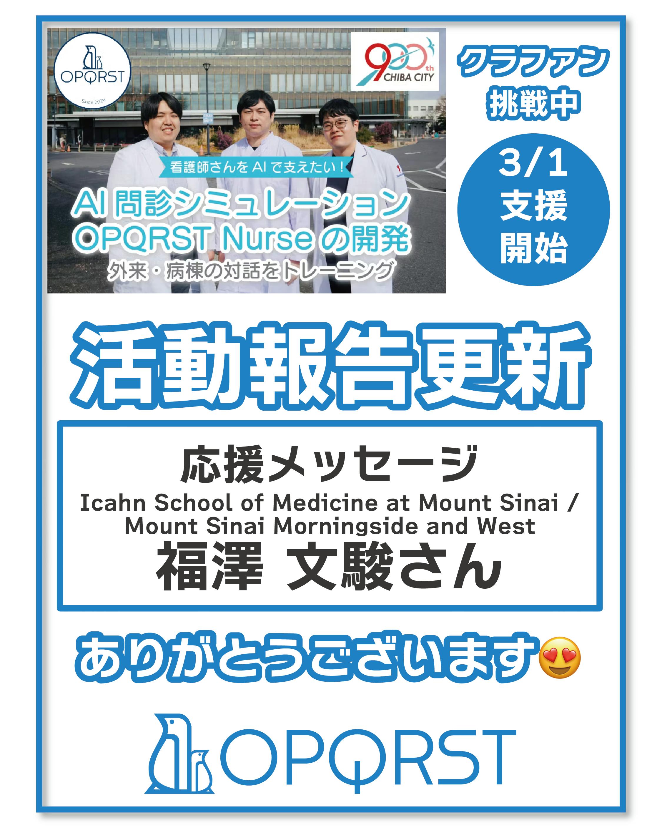 ニューヨークの Icahn School of Medicine at Mount Sinai / Mount Sinai Morningside and West で内科医として働いている 福澤文駿さん からメッセージをもらいました。
