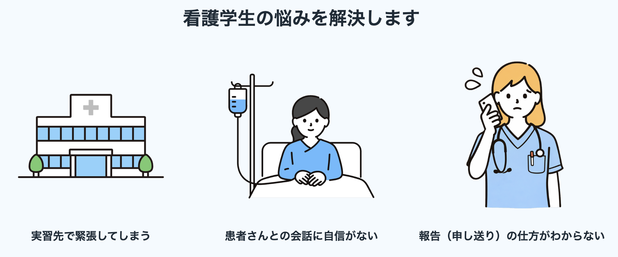 私たちは看護学生・看護師の方へのヒアリングを通して、看護学生がぶつかる悩みを同定しました。OPQRST Nurseでは