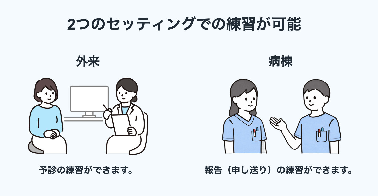 外来では予診として、医師の診察を補助し、効率的な外来運用のための練習が可能です。