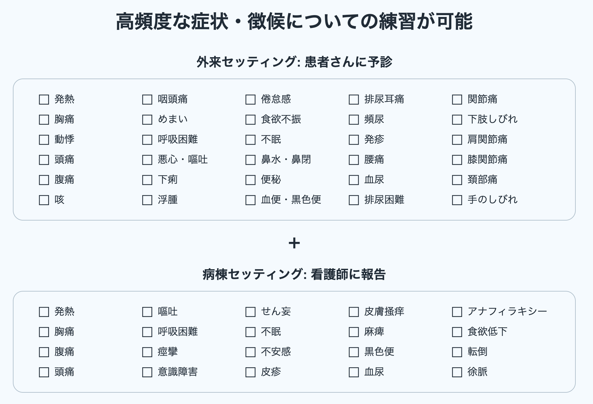 珍しい病気についての問診をするのではありません。よくある症状・症候を自信を持って問診できるようになることがこのサービスの目的です。そのため、高頻度疾患・高頻度な病棟トラブルを中心に準備しています!