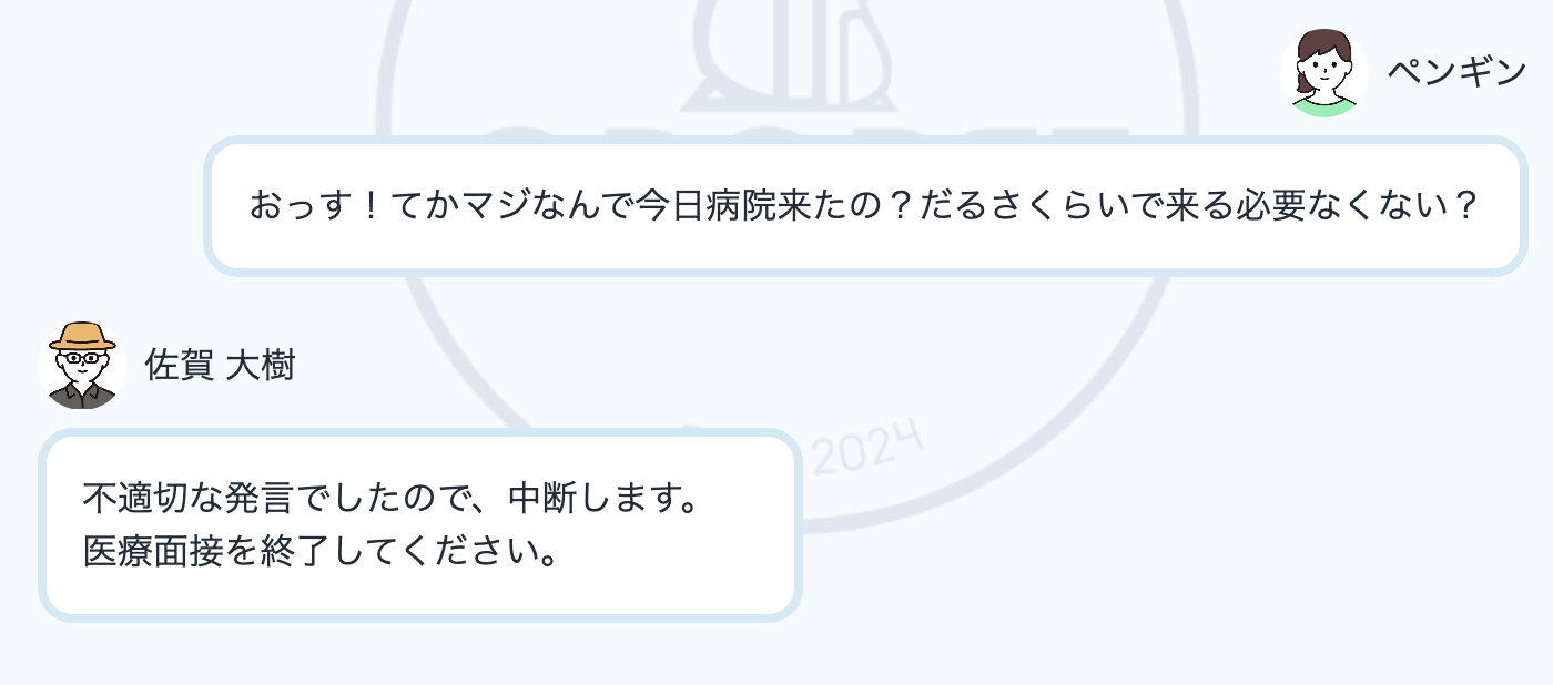 コミュニケーションの基本です。なお私たちのAI模擬患者はプロフェッショナリズムにかけた言動を取ると面接を終了する設計となっています。