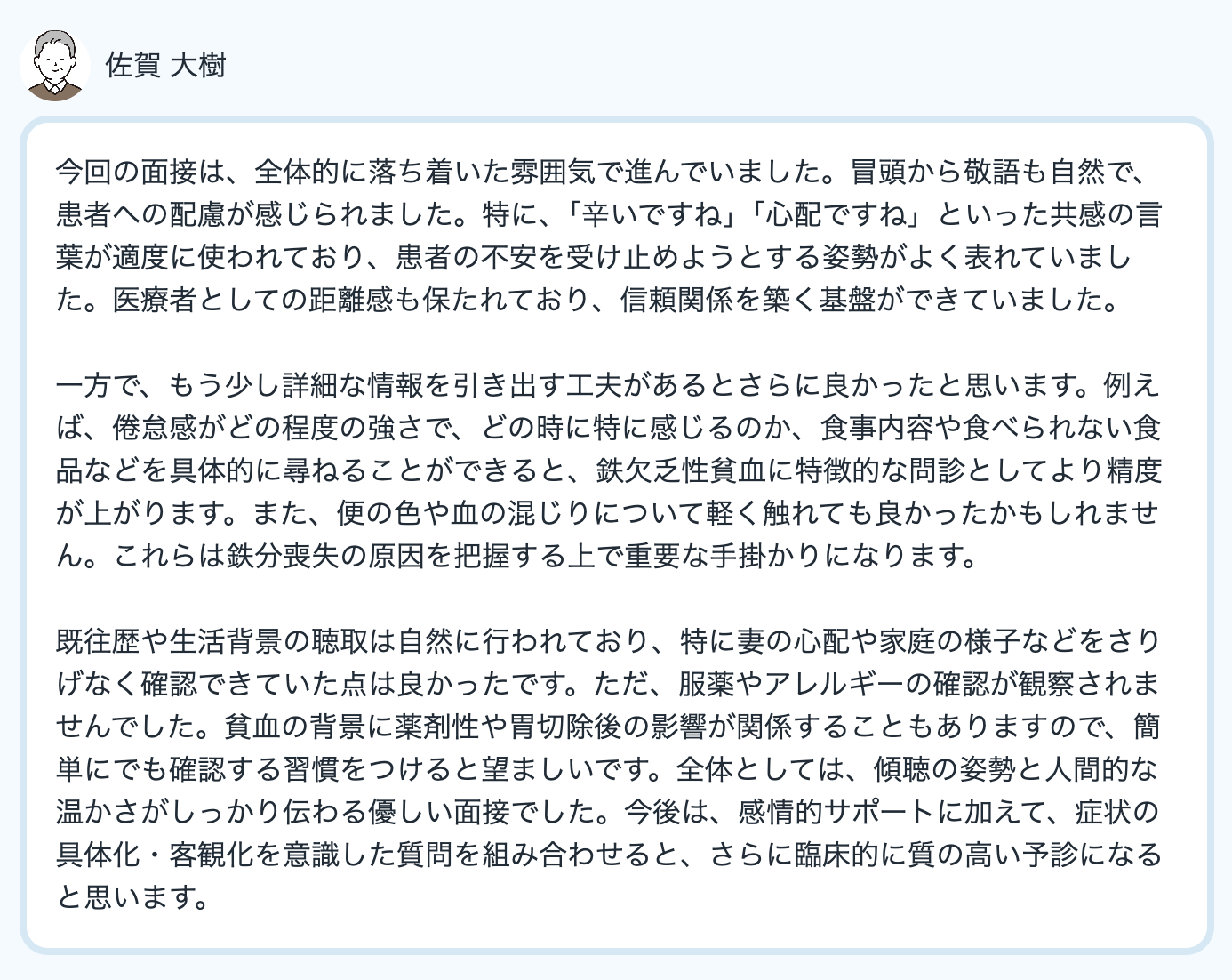 フィードバックでは、できたことと、もうすこし頑張ってほしいことを、AI模擬患者自身から教えてくれます。また次回の練習の参考にしましょう。