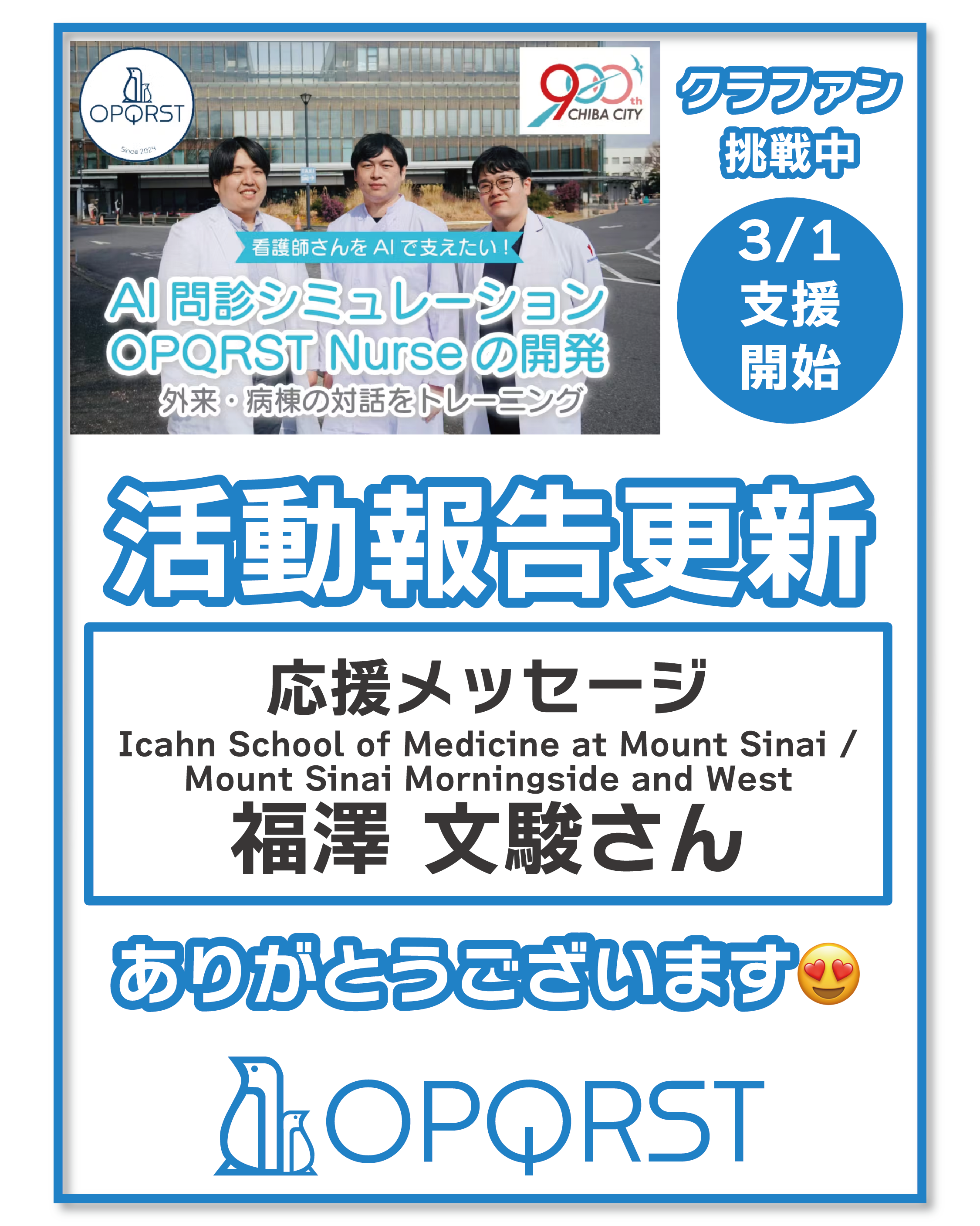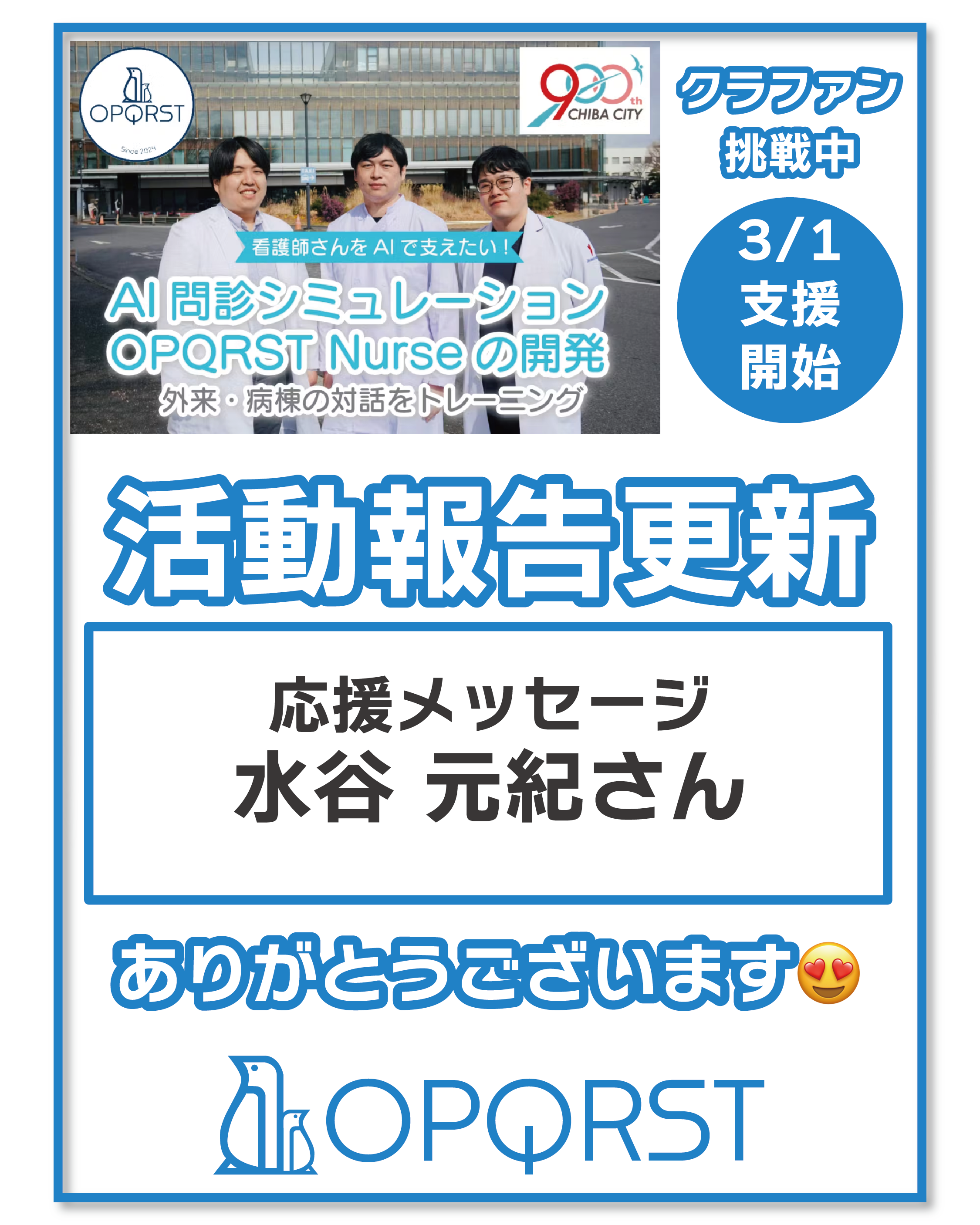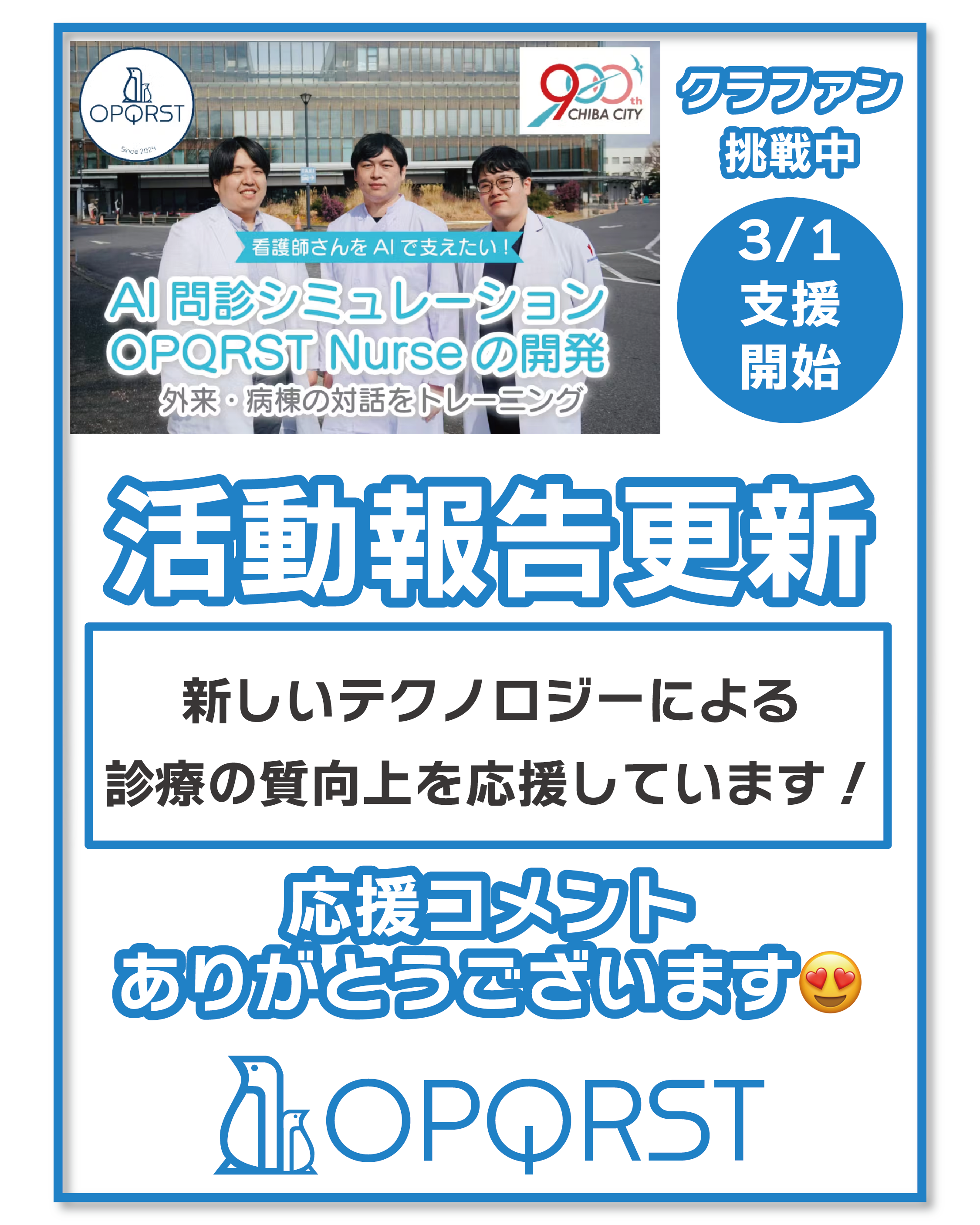 おはようございます、OPQRSTです!今日は支援コメントをピックアップします。プロジェクト開始から10日…ご支援は33%超へプロジェクト開始前、私たちが直面した懸念は応援してくれる人にうまくつながることができるだろうか、という点でした。久しぶりに連絡させていただく方、お世話になった人生の先輩方、家族や友人、色んな人にプロジェクトのことを伝えました。私がまず驚いたのは、久しぶりに連絡したのに快く繋がってくださる方々の多さです。今の仕事が忙しくて、連絡を取り続けることができなかった後ろめたさがありました。そんな私にも皆さまは快く声をかけてくださいます。ここでご紹介できない個人的なメッセージもたくさんいただきました。そして実際にこうやって支援をしてくださる状況が、本当に嬉しく思います。ありがとうございます。今日も支援コメントを紹介させてください。全国とつながること、千葉から日本へuser_519abae10d34 様微力ながら、愛媛から応援しています!頑張ってください!!ご支援いただきありがとうございます!私はこのコメントをいただいた時に、ご支援いただいた方のお顔がありありと思い浮かびました。そうです、最近連絡することができていなかったのに、突然の連絡にもかかわらず快くお返事をいただいた方の一人です。自分たちの都合で連絡したことに後ろめたさも感じました。ですが、ご連絡いただくだけでなく、こうやって実際にご支援いただけたことがとてもあたたかく嬉しかったです。このようなご支援やつながりをきっかけに、また次のプロジェクトにつながる。そういった実感もいただけました。OPQRST NurseはWebサービスです。私たちは千葉から発進していますが、いずれ必ず千葉から日本全国へ届けていきたいと思います。遠くにお住いの方にもこのプロジェクトを知っていただきたいです。ぜひお知り合いの方へのシェア・拡散も引き続きお願い致します!そして、user_d485e355b784 様応援ありがとうございます!ご支援の気持ちはコメントにとどまらず、私たちに直接伝わっています!皆様のひとつひとつの支援がこのプロジェクトの成功につながります。皆様のご支援、本当にありがとうございます!!さらに支援の輪が広がっていってほしいです。皆様の支援・シェアがとっても大きな力になります。InstagramやXもぜひよろしくお願いします。https://www.instagram.com/opqrst_inc/https://x.com/OPQRST_Inc/