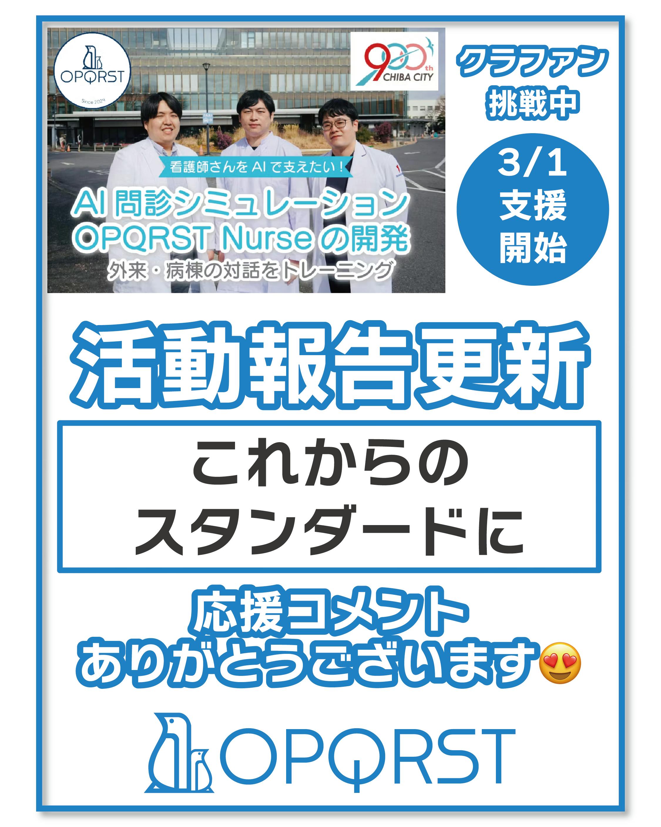 おはようございます、OPQRSTです!今日は支援コメントをピックアップします。プロジェクト開始から10日…ご支援は33%超へプロジェクト開始前、私たちが直面した懸念は応援してくれる人にうまくつながることができるだろうか、という点でした。久しぶりに連絡させていただく方、お世話になった人生の先輩方、家族や友人、色んな人にプロジェクトのことを伝えました。私がまず驚いたのは、久しぶりに連絡したのに快く繋がってくださる方々の多さです。今の仕事が忙しくて、連絡を取り続けることができなかった後ろめたさがありました。そんな私にも皆さまは快く声をかけてくださいます。ここでご紹介できない個人的なメッセージもたくさんいただきました。そして実際にこうやって支援をしてくださる状況が、本当に嬉しく思います。ありがとうございます。今日も支援コメントを紹介させてください。全国とつながること、千葉から日本へuser_519abae10d34 様微力ながら、愛媛から応援しています!頑張ってください!!ご支援いただきありがとうございます!私はこのコメントをいただいた時に、ご支援いただいた方のお顔がありありと思い浮かびました。そうです、最近連絡することができていなかったのに、突然の連絡にもかかわらず快くお返事をいただいた方の一人です。自分たちの都合で連絡したことに後ろめたさも感じました。ですが、ご連絡いただくだけでなく、こうやって実際にご支援いただけたことがとてもあたたかく嬉しかったです。このようなご支援やつながりをきっかけに、また次のプロジェクトにつながる。そういった実感もいただけました。OPQRST NurseはWebサービスです。私たちは千葉から発進していますが、いずれ必ず千葉から日本全国へ届けていきたいと思います。遠くにお住いの方にもこのプロジェクトを知っていただきたいです。ぜひお知り合いの方へのシェア・拡散も引き続きお願い致します!そして、user_d485e355b784 様応援ありがとうございます!ご支援の気持ちはコメントにとどまらず、私たちに直接伝わっています!皆様のひとつひとつの支援がこのプロジェクトの成功につながります。皆様のご支援、本当にありがとうございます!!さらに支援の輪が広がっていってほしいです。皆様の支援・シェアがとっても大きな力になります。InstagramやXもぜひよろしくお願いします。https://www.instagram.com/opqrst_inc/https://x.com/OPQRST_Inc/