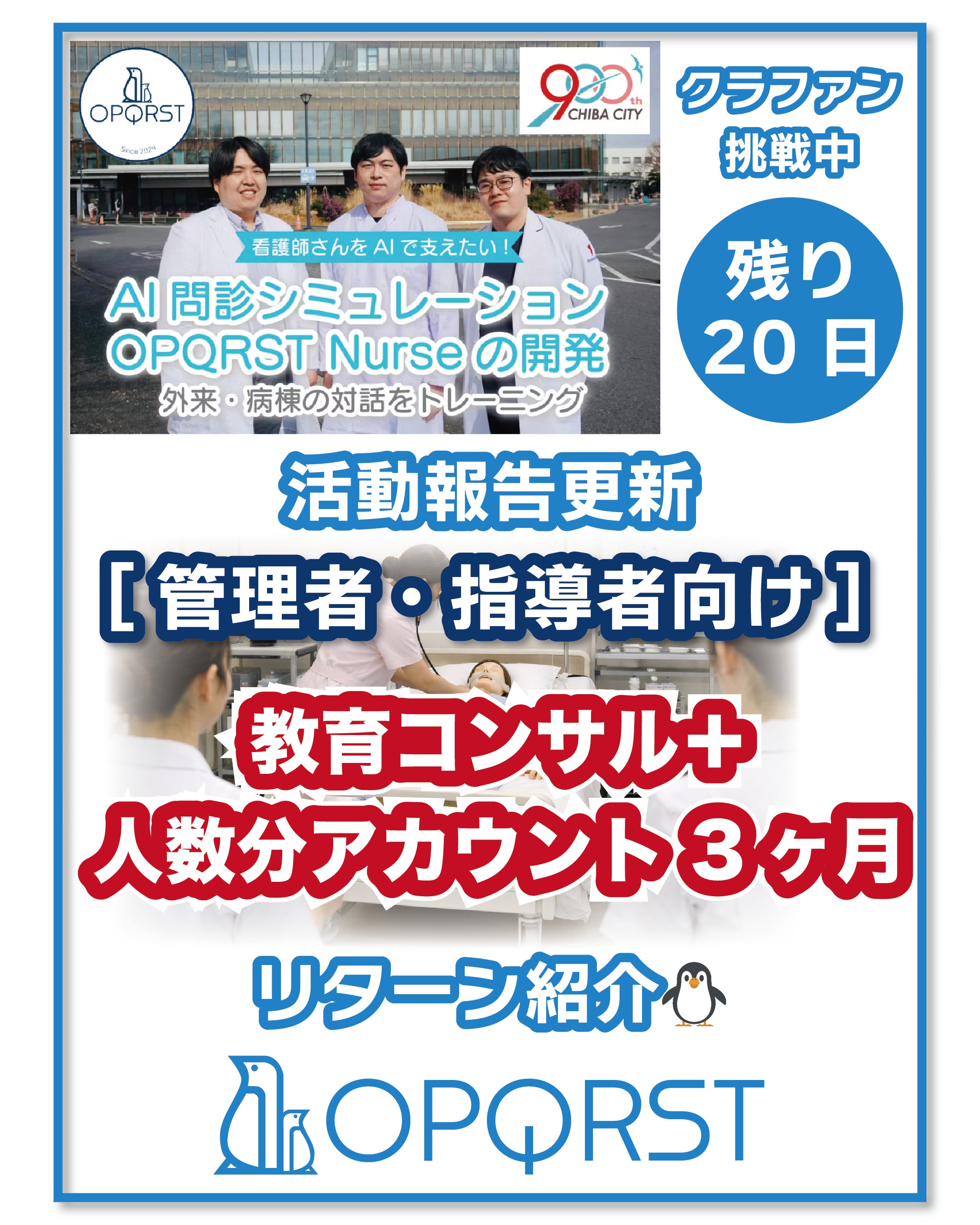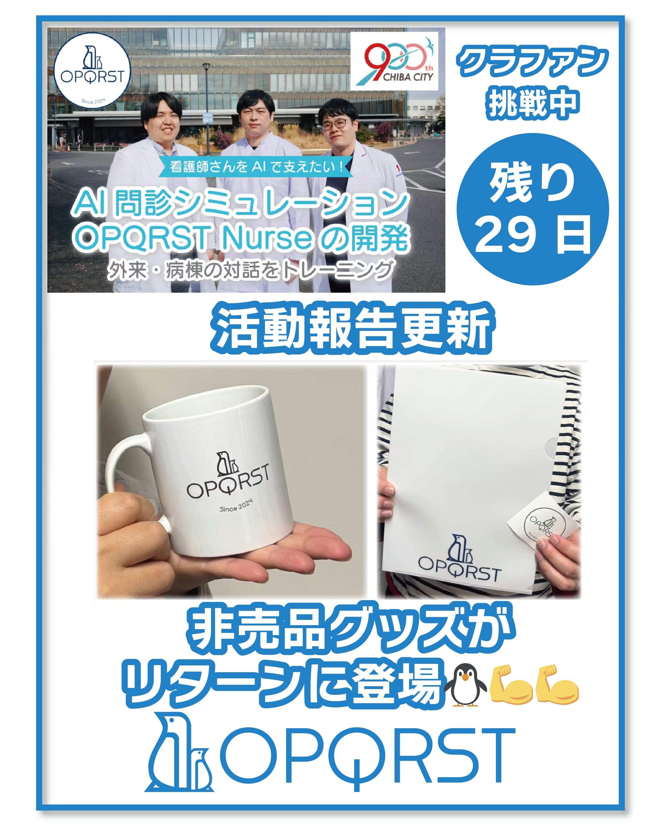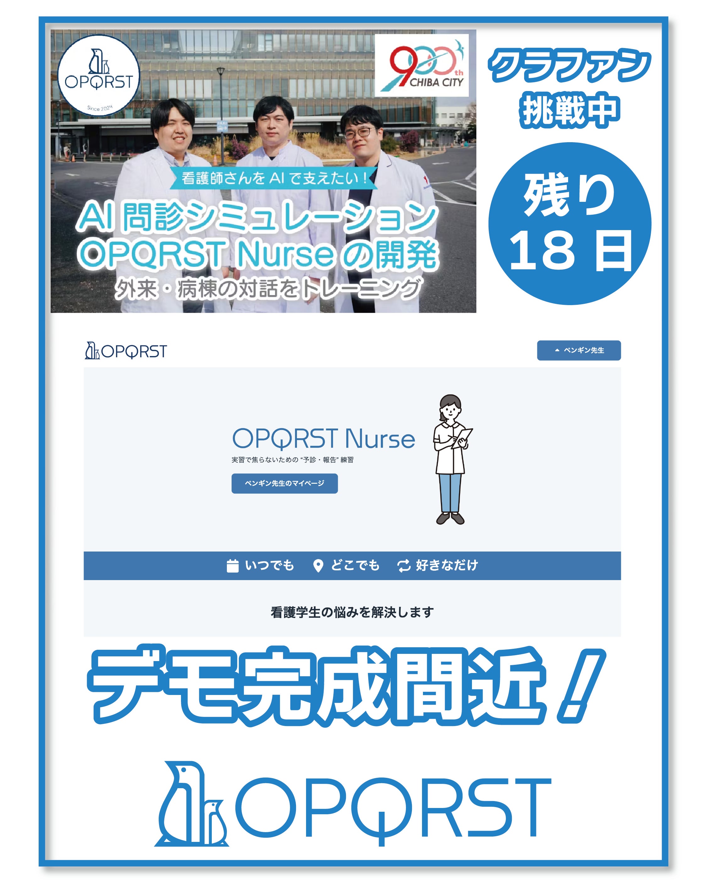 おはようございます、OPQRSTです今日から新年度ですね当社の中でも新年度で少し状況が代わるスタッフがおりまして、久しぶりにワクワクする新年度を迎えているようです本日は皆様にもワクワクをお届け!OPQRST Nurseのデモ版が完成間近となりました!現在は、ユーザーインターフェースの設計が終盤を迎え、肝となる問診AI部分の最終調整に入っています。進捗をまた報告したいと思います。ご支援いただいた方、ぜひ引続き応援をよろしくお願いします!★★★★★★★★★★★★支援は残り20日を切りました。引き続き皆様の支援・シェアが大きな力になります。InstagramやXもぜひよろしくお願いします。https://www.instagram.com/opqrst_inc/https://x.com/OPQRST_Inc/