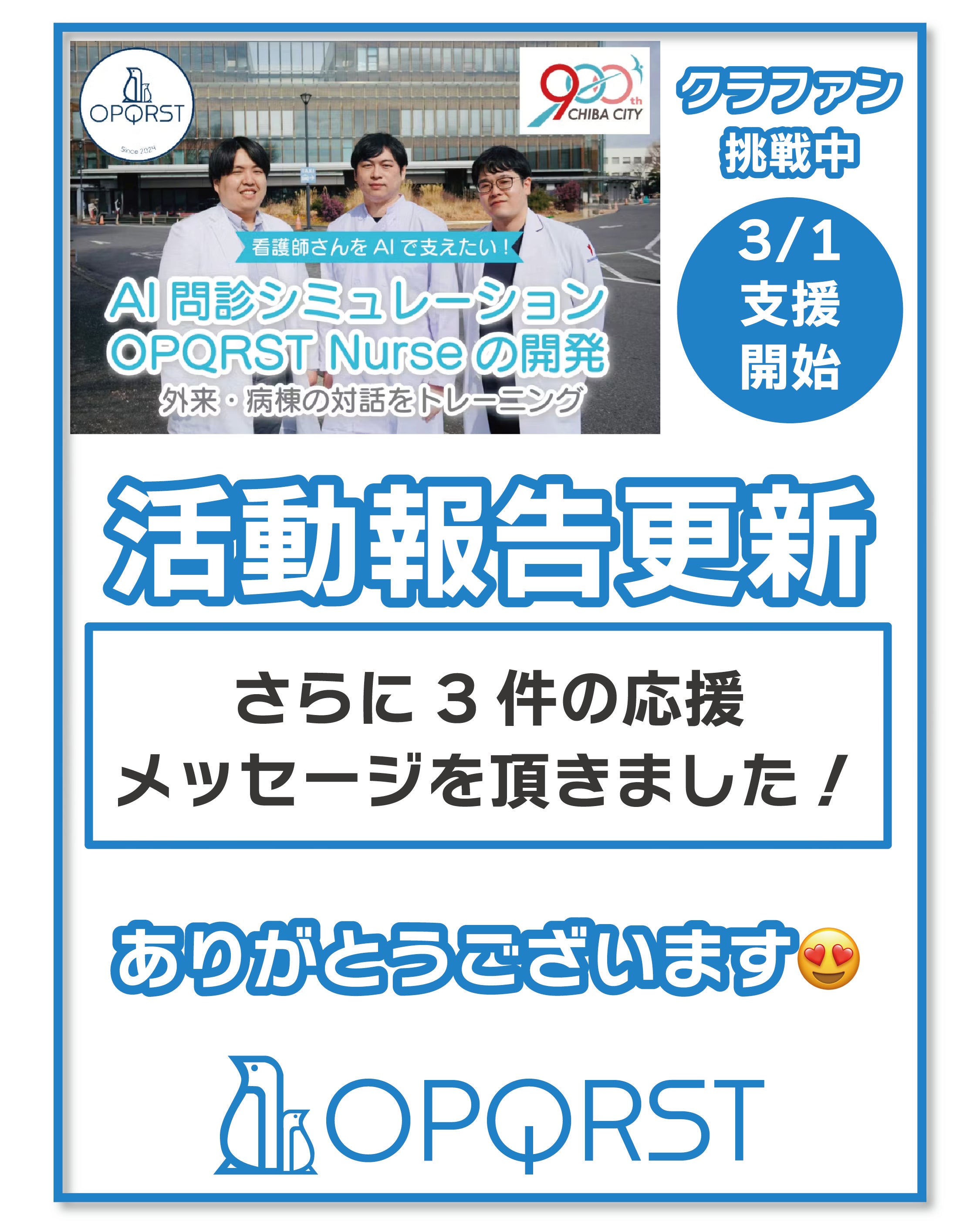 おはようございます!OPQRSTです本日は横浜市立大学 医学部医学科 総合診療医学 診療講師の石塚晃介先生から応援メッセージを頂きましたので紹介します。応援メッセージはこちらからご覧ください総合診療の最前線石塚先生は千葉大学病院総合診療科の同門で、現在は母校に戻って診療・教育・研究を行っている先生です。お忙しい中メッセージを頂きありがとうございます!石塚先生のメッセージの中で印象に残ったのは、「問診で得られる情報が、その後の診療の方向性を左右する」という部分です。問診は、病気の診断をするときに重要であるだけではなく、治療方針の決定や、治療効果判定にももちろん重要です。当たり前ですが、患者さんの言葉は検査で測ることはできません。検査の実施には決まった方法や試薬が必要ですが、問診はそのスキルが個人の医師の技量に大きく依存します。まず医師としてそのスキルを上げることが、診療の基礎力として必要と私たちは考えます。繰り返すことで身につくことさらに石塚先生は「安全な環境で何度でも試行錯誤できるシミュレーションは、実践的なコミュニケーション能力を高めるうえで大きな価値を持つはずです。」ともコメントしてくれました。私たちが医学生から医師になるときに感じた大きな違和感は、テキストの上にある情報は、患者さんの中にある情報で、これを診療するために取り出さないといけないだという実感です。検査をすることで、客観的に取り出す事もできます。しかし、病歴聴取として情報を取り出す技術が必要で、それが初期研修医の自分にはあまりにも足りないことがわかったのです。自分がどの様にその力を得ていったのかといえば、当然ですが患者さんに教えてもらいました。先輩医師から問診の方法や技術を教えてもらっても、それを実践するのは生身の人間です。問診技術が身につくまでの間、患者さんに不利益があってはもちろんいけません。安全に、精度高い問診をするためには、何より繰り返し練習できる「模擬患者」が必要です。教育の現場で使ってほしいすべてのひよこがにわとりになるとき、ただ時間と栄養があれば成長できるかもしれません。すべての医療系学生が医師になるとき、時間と栄養だけではなく経験が必要です。今回「OPQRST Nurse」が社会に広がることで、より多くの経験を与えることができるようになります。翻って、支援者の皆様にとどく医療の質が上がるよう、開発を続けてまいります。石塚先生、どうもありがとうございました!★★★★★★★★★★★★支援は残り2週間を切りました。引き続き皆様の支援・シェアが大きな力になります。InstagramやXもぜひよろしくお願いします。https://www.instagram.com/opqrst_inc/https://x.com/OPQRST_Inc/